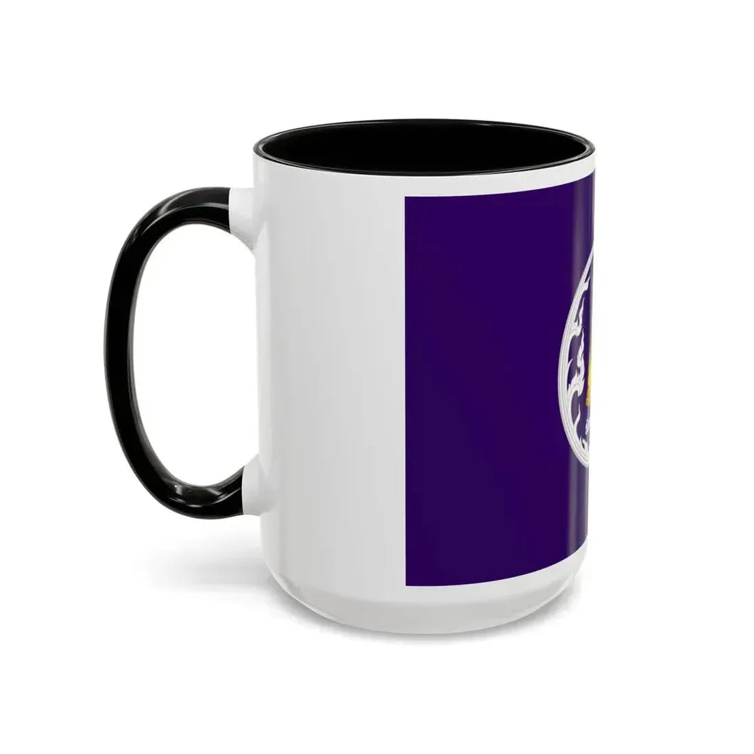 Delve into the rich heritage of Thailand with this unique Accent Coffee Mug, designed featuring the Flag of Phitsanulok Province. This mug showcases a graphic representation of the Phitsanulok flag, which is adorned with a white elephant standing on three hills and eight white stripes along the edges. The design symbolizes the province's history and traditions, making it an excellent conversation starter for anyone fascinated by Thai culture or Southeast Asian history.