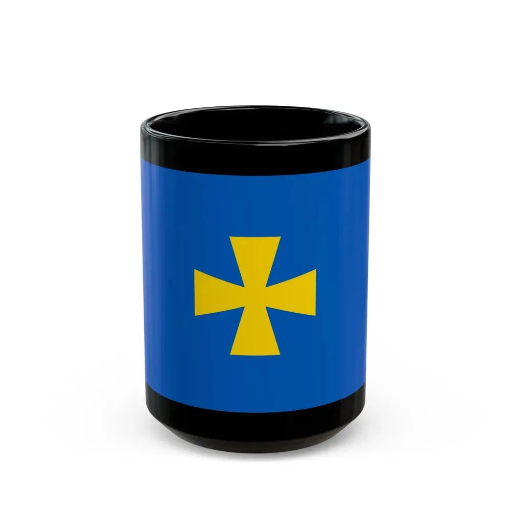 This Black Coffee Mug showcases the Flag of Poltava Oblast Ukraine as its design. The flag features a gold coat of arms centered on a field of azure blue. The coat of arms consists of a golden sun with rays extending to all sides, representing the region's rich history and sunlight-filled landscapes. The Flag of Poltava Oblast is a symbol of Ukrainian pride, making this mug perfect for anyone who appreciates unique and cool drinkware that reflects their cultural interests.