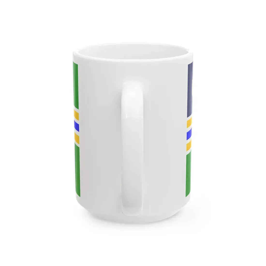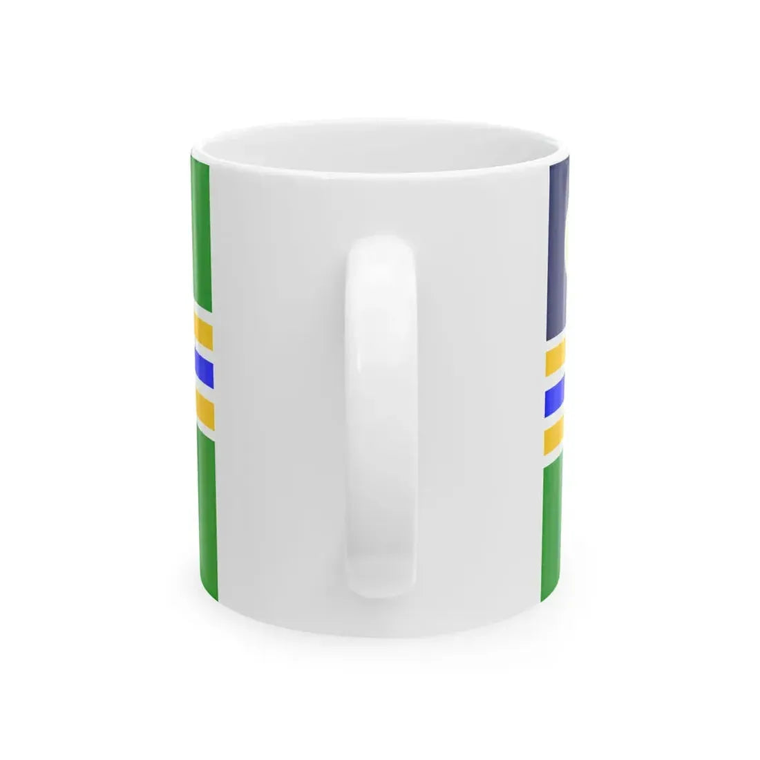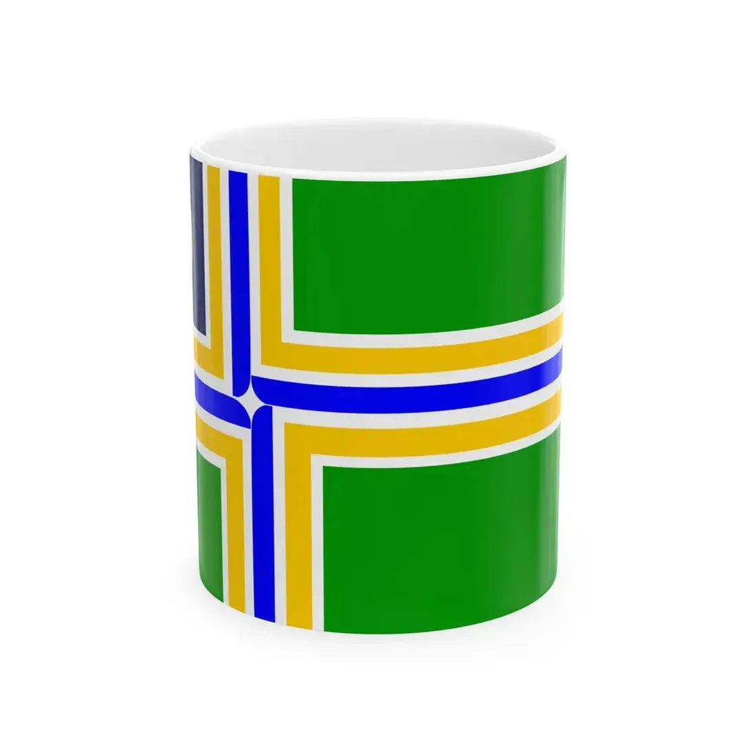 This white coffee mug showcases a distinctive design inspired by the Flag of Portland, Oregon used between 1970 and 2002. The flag, which features an evergreen tree on a field of green bordered by white and gold stripes, represents the city's rich history and natural beauty. This design is a tribute to that era, making it perfect for anyone who appreciates unique and cool drinkware as well as Portland enthusiasts or history buffs.