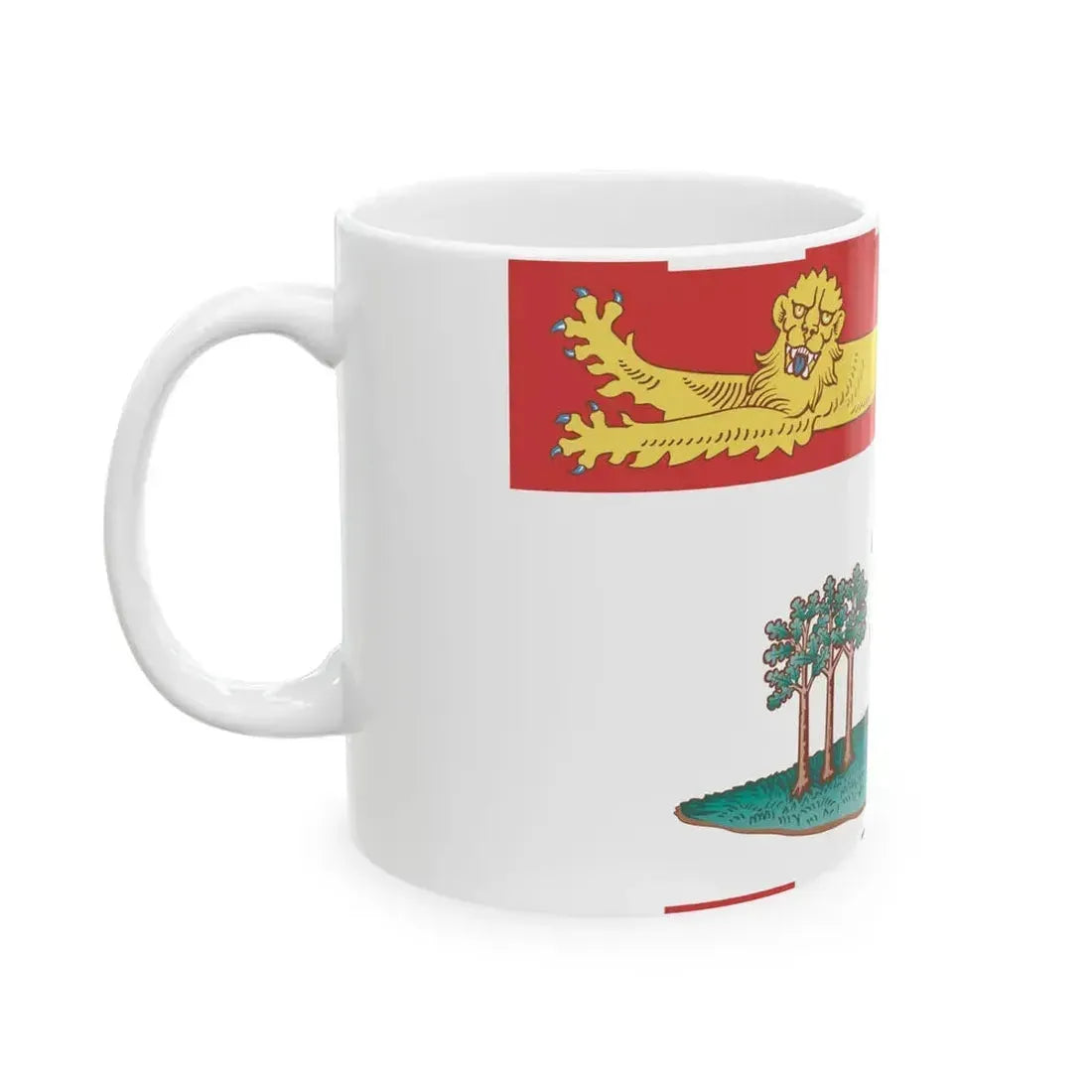 Step back in time with our Flag of Prince Edward Island (Canada) White Coffee Mug. This design showcases a vibrant and intricate reproduction of the official flag of Canada's smallest province, Prince Edward Island. The flag's red background is emblazoned with a golden crown above a white field bearing three fleurs-de-lis - all elements faithfully represented in this detailed artwork. Perfect for anyone who appreciates unique and cool drinkware, particularly those with a keen interest in Canadian history or geography.