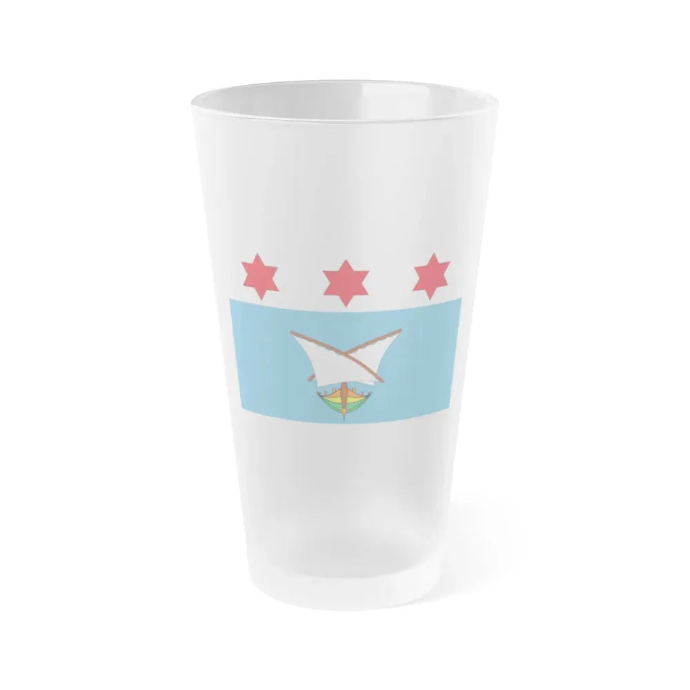 Frosted pint glass (16 oz / ≈0.47 L) with a soft matte finish and semi-translucent, one-sided print. Tough enough for bar and restaurant use, dishwasher safe, and BPA-free — a modern take on classic pintware.