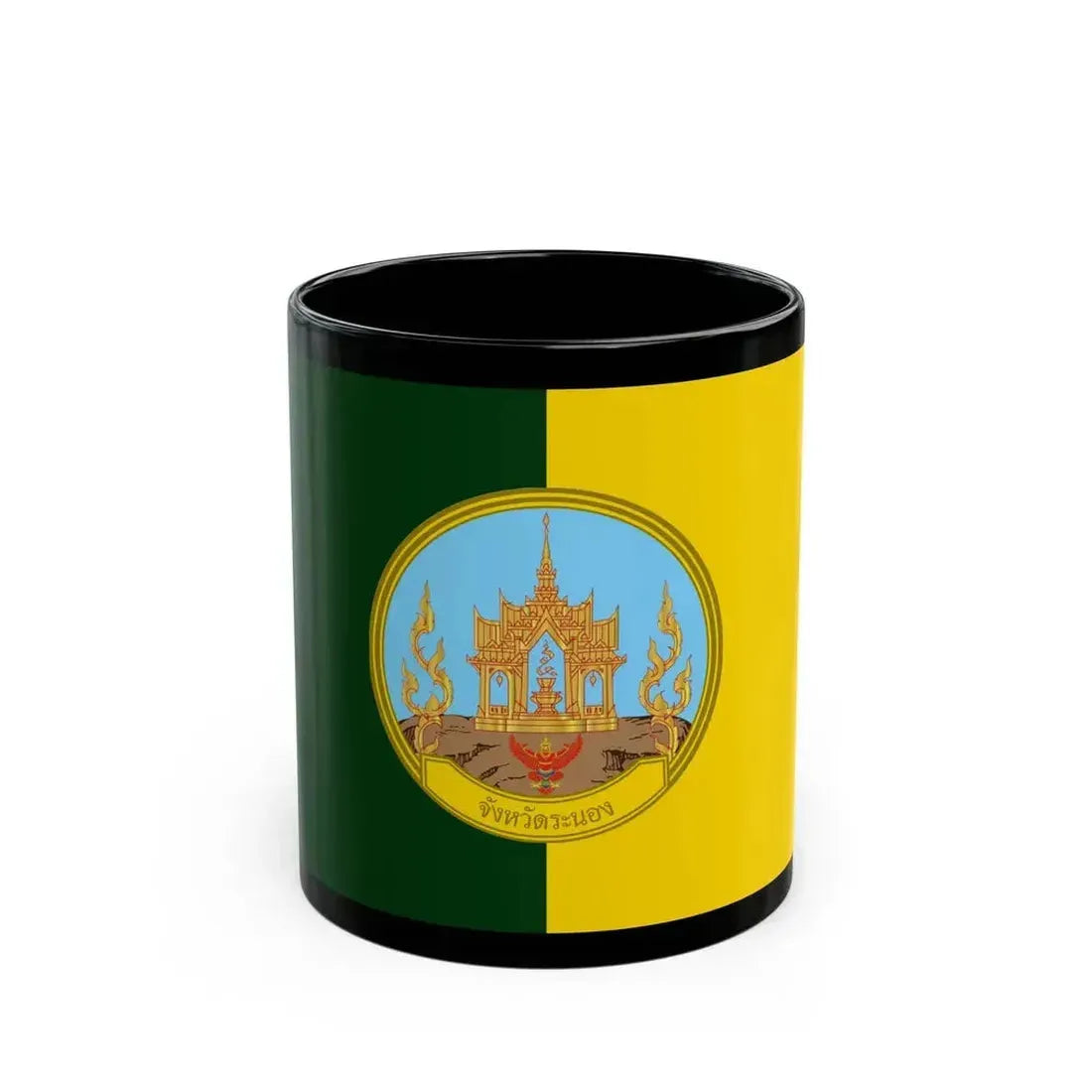 This black coffee mug serves as a tangible representation of the flag's symbolism and beauty. It not only functions as a practical household item but also serves as a conversation starter about the rich history and traditions associated with Ranong Province. Perfect for anyone who appreciates unique and cool drinkware, especially those with a keen interest in Thai culture or travel.