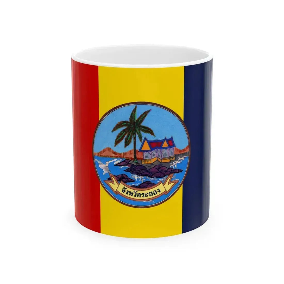 This white coffee mug showcases an iconic design inspired by the Flag of Rayong Province, Thailand. The flag's design is prominently displayed on the mug, featuring a red field with a white elephant at the center, symbolizing prosperity and power. The lower half of the flag displays three horizontal stripes in blue, yellow, and red, representing the sea, rice, and fields respectively. This unique drinkware piece makes an excellent choice for anyone who admires Thai culture or has a fondness for Southeast Asian aesthetics.