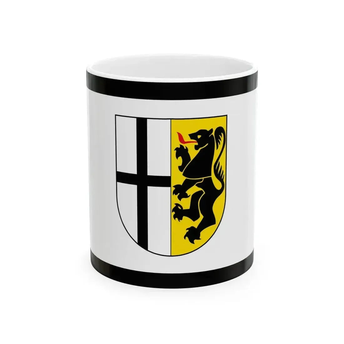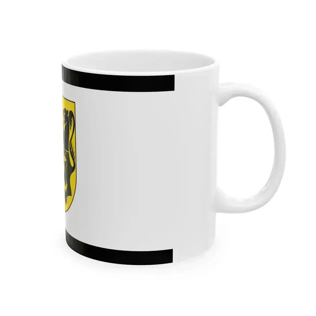 This white coffee mug showcases an intriguing design that represents the flag of Rhein Kreis Neuss, a district in Germany. The artwork on this mug features the emblematic elements from the official flag, such as the blue and yellow stripes interspersed with three green oak leaves. This design not only reflects the regional pride but also serves as an excellent conversation starter for those who appreciate German history or geography.