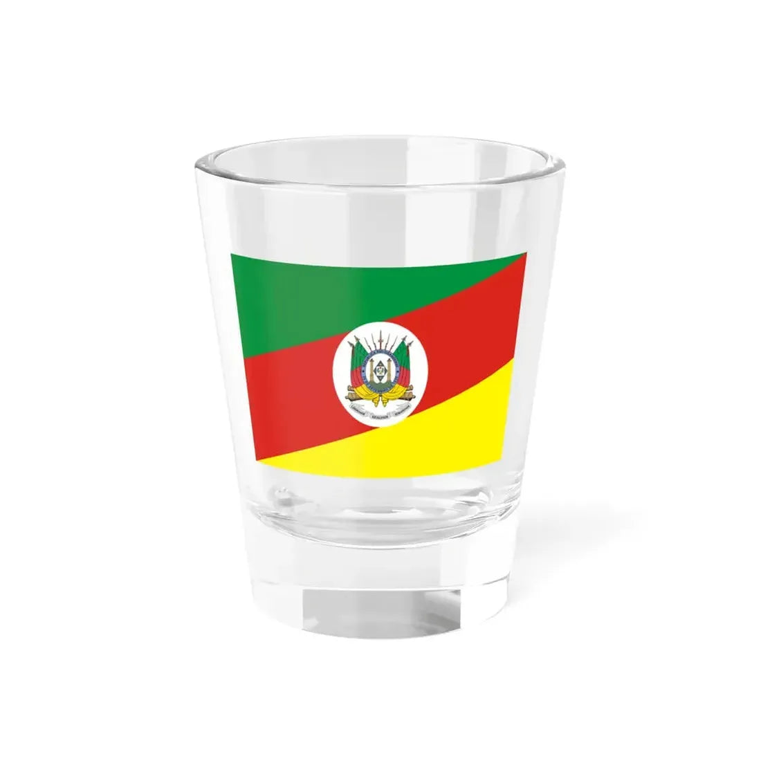This 1.5oz shot glass showcases a vibrant design inspired by the Flag of Rio Grande do Sul, Brazil. The flag's four horizontal stripes in yellow, green, blue, and white are replicated on the glass, symbolizing the state's four historic provinces. A large circular seal, featuring a cogwheel and a southern cross, represents the state capital, Porto Alegre. This unique drinkware piece serves as a tasteful reminder of Brazilian culture and regional heritage, making it perfect for anyone who appreciates unique and cool drinkware.