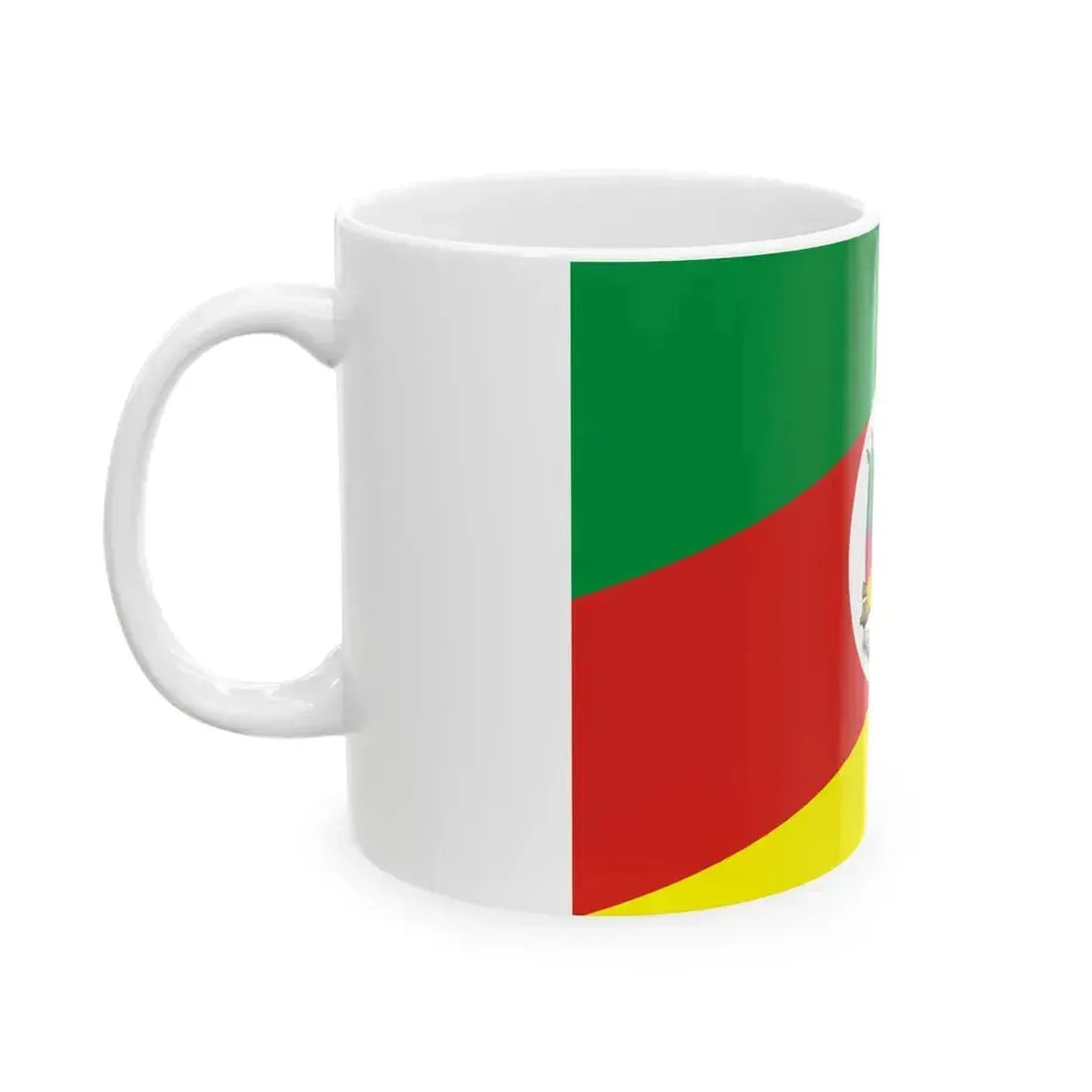 Embodying the rich cultural heritage of Rio Grande do Sul, Brazil, this White Coffee Mug showcases a design inspired by the region's iconic flag. The mug features a vibrant green field, symbolizing hope and prosperity, divided by two horizontal white stripes that represent unity and peace. Overlaid on the field is a large, royal-blue circle filled with nine smaller white circles, representing the nine original municipalities of Rio Grande do Sul. This unique design makes for an engaging conversation piece, perfect for anyone who appreciates unique and cool drinkware, as well as those who hold a special place in their heart for Brazilian culture.