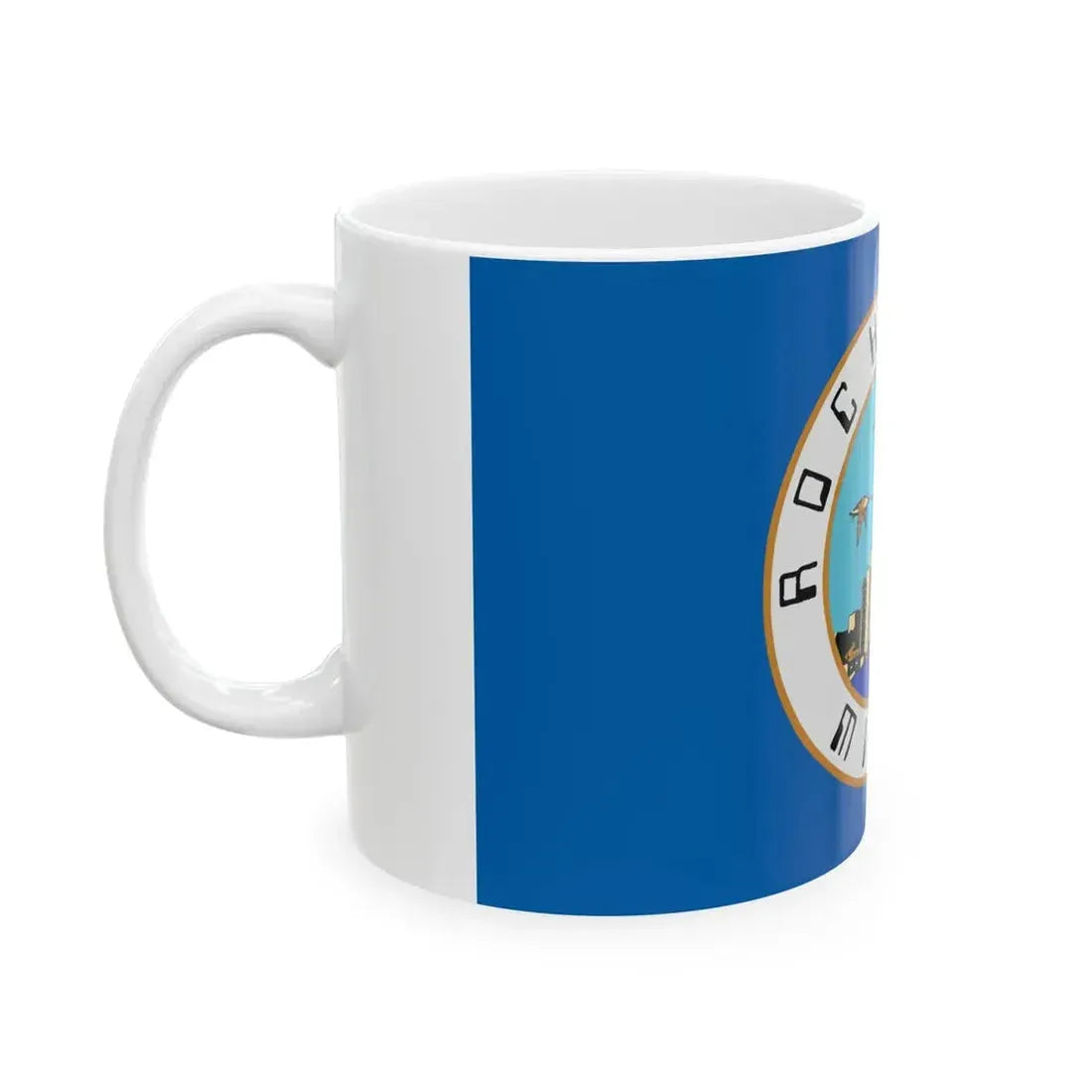 This White Coffee Mug showcases a design inspired by the Flag of Rochester, Minnesota (United States). The flag features a shield divided into four quarters, each representing different aspects of the city's history and culture. The top left quarter is in blue, symbolizing the city's connection to the Mayo Clinic, while the bottom right quarter represents the Zumbro River in white. The remaining quarters depict a stalk of wheat (yellow) for agriculture, and an open Bible (red), reflecting Rochester's religious heritage. This mug is perfect for anyone who appreciates unique and cool drinkware, as well as those with connections to or fondness for the city of Rochester.