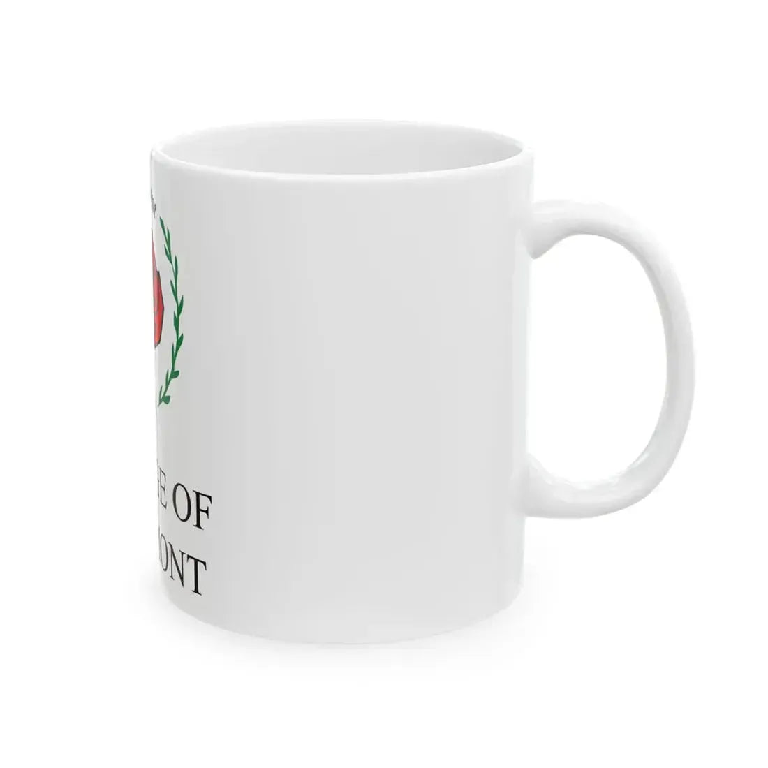 This white coffee mug showcases the official Flag of Rosemont, Illinois, United States. The design on this mug replicates the flag's distinctive elements faithfully. The flag features a blue field divided diagonally from the lower hoist-side corner with a diagonal line extending to the upper fly side corner, forming two triangles. The left triangle bears three red six-pointed stars and the right triangle contains a red and white striped pattern symbolizing the Chicago Flag. This mug is ideal for locals or admirers of Rosemont's unique heritage, as well as anyone who appreciates civic pride memorabilia.