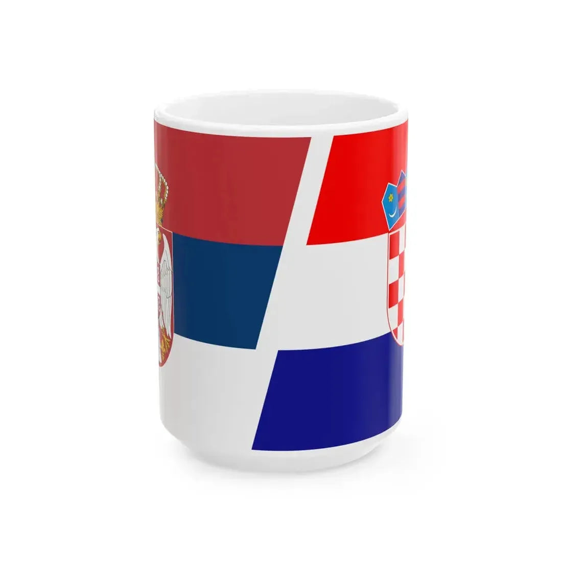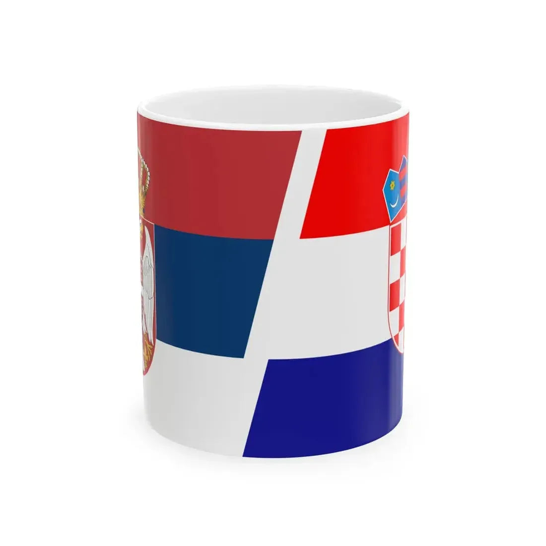 This unique White Coffee Mug showcases a design that symbolizes both Serbia and Croatia through their respective national flags. The Balkan region's rich history and cultural heritage are encapsulated in this coffee mug's artwork. It serves as an excellent conversation starter for those with a keen interest in geopolitics, history, or the Balkans. The design is beautifully rendered, with precise attention to detail, making it aesthetically pleasing to look at and handle.