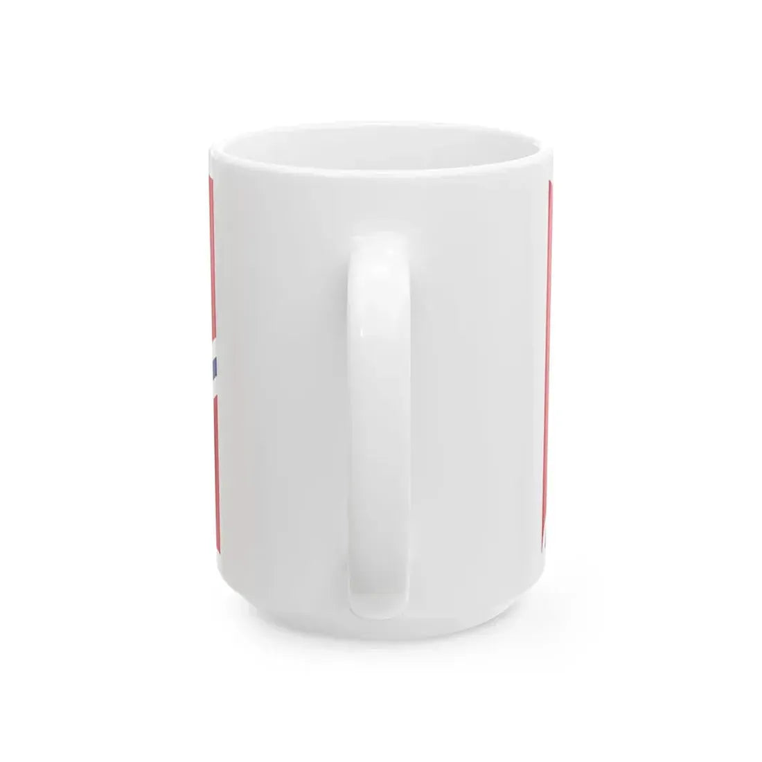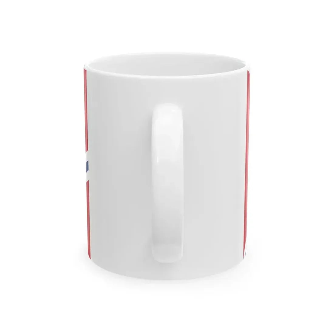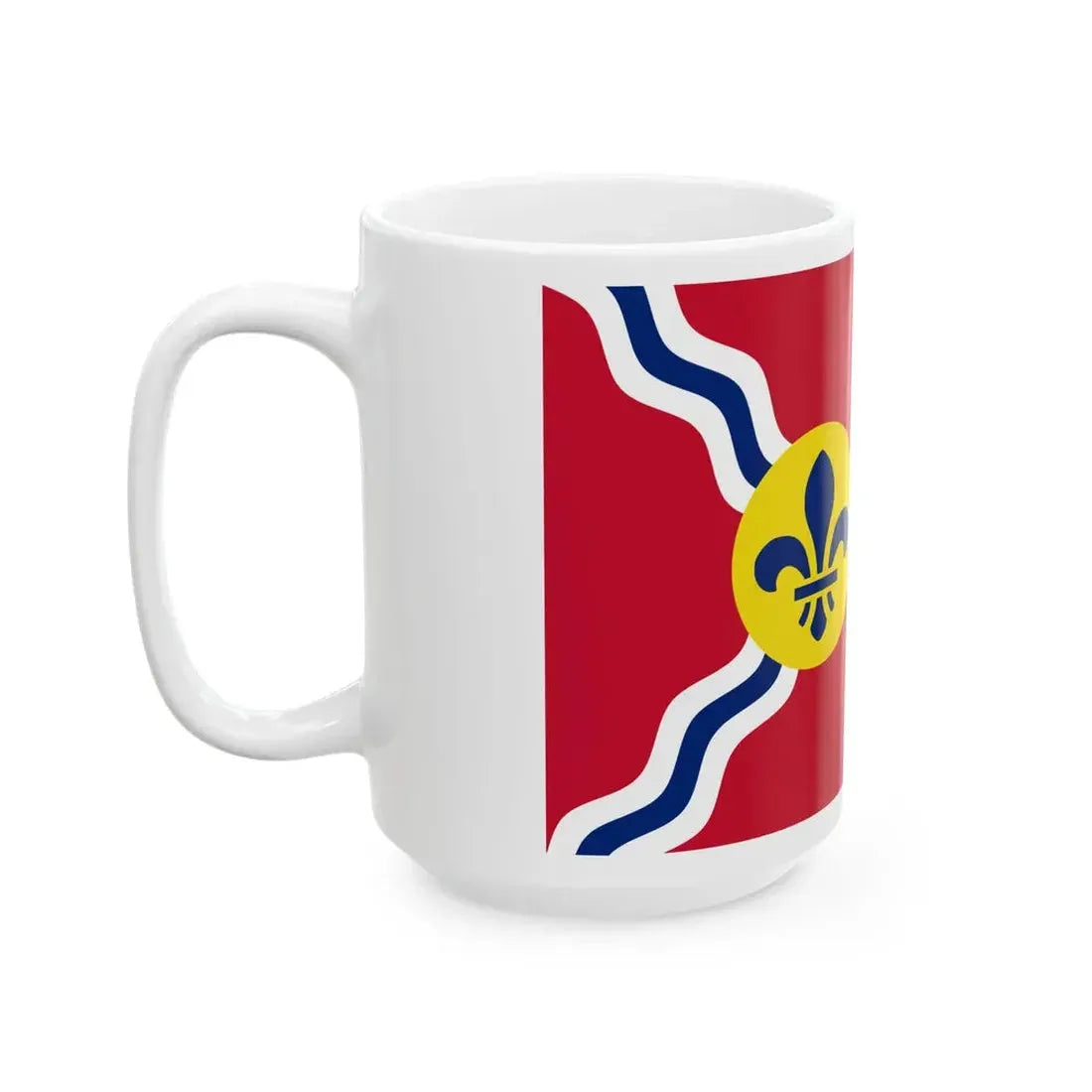 The Flag of St. Louis Missouri is a symbol of the rich history and cultural heritage of the city. This design is beautifully replicated on this white coffee mug, making it an excellent addition to any kitchen or office collection. The flag features the French coat of arms, a testament to the city's French colonial roots, along with three fleurs-de-lis representing Louis IX of France, the city's namesake.
