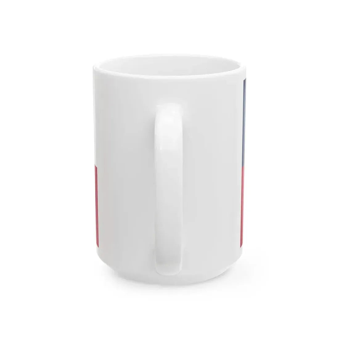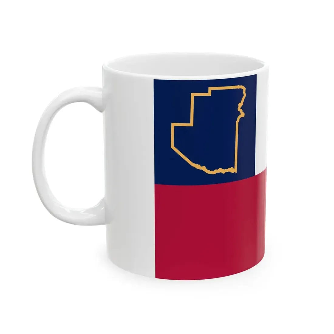 This White Coffee Mug showcases a unique design inspired by the Flag of Terrell County, Texas, United States. The flag's star, symbolizing the county seat, is prominently displayed, along with the red and white stripes that represent courage and valiance, symbols deeply rooted in American history. This mug makes an excellent choice for those who take pride in their Texan heritage or have a special connection to Terrell County.