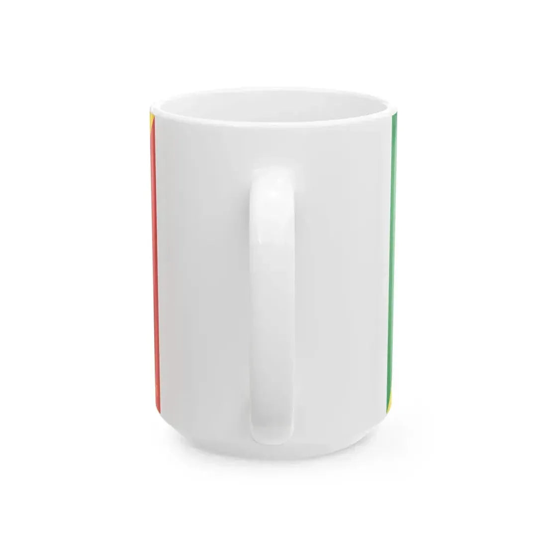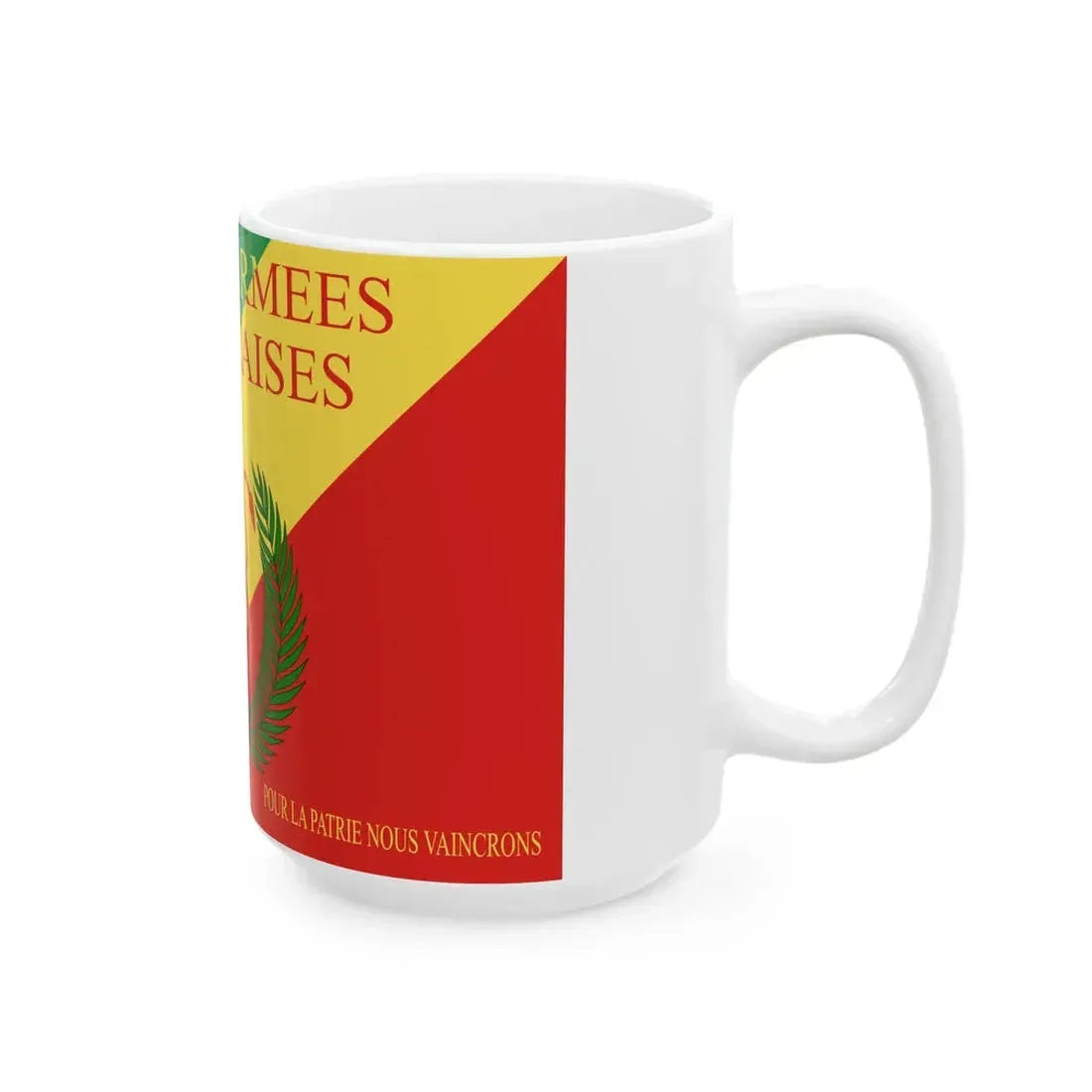 The "Flag of the Armed Forces of the Republic of the Congo (Congo) White Coffee Mug" showcases an iconic representation of military symbolism within the context of the African nation. The design on this mug mirrors the official flag of the Armed Forces of the Republic of the Congo, a tricolor flag composed of three vertical stripes - green, yellow, and red, with a unique emblem in the center. This emblem includes a shield, a cannon, a star, and the motto "Unité, Progrès, Justice" (Unity, Progress, Justice). The use of this design on a coffee mug offers a unique way to celebrate and appreciate the rich military history and symbolism of the Republic of the Congo.