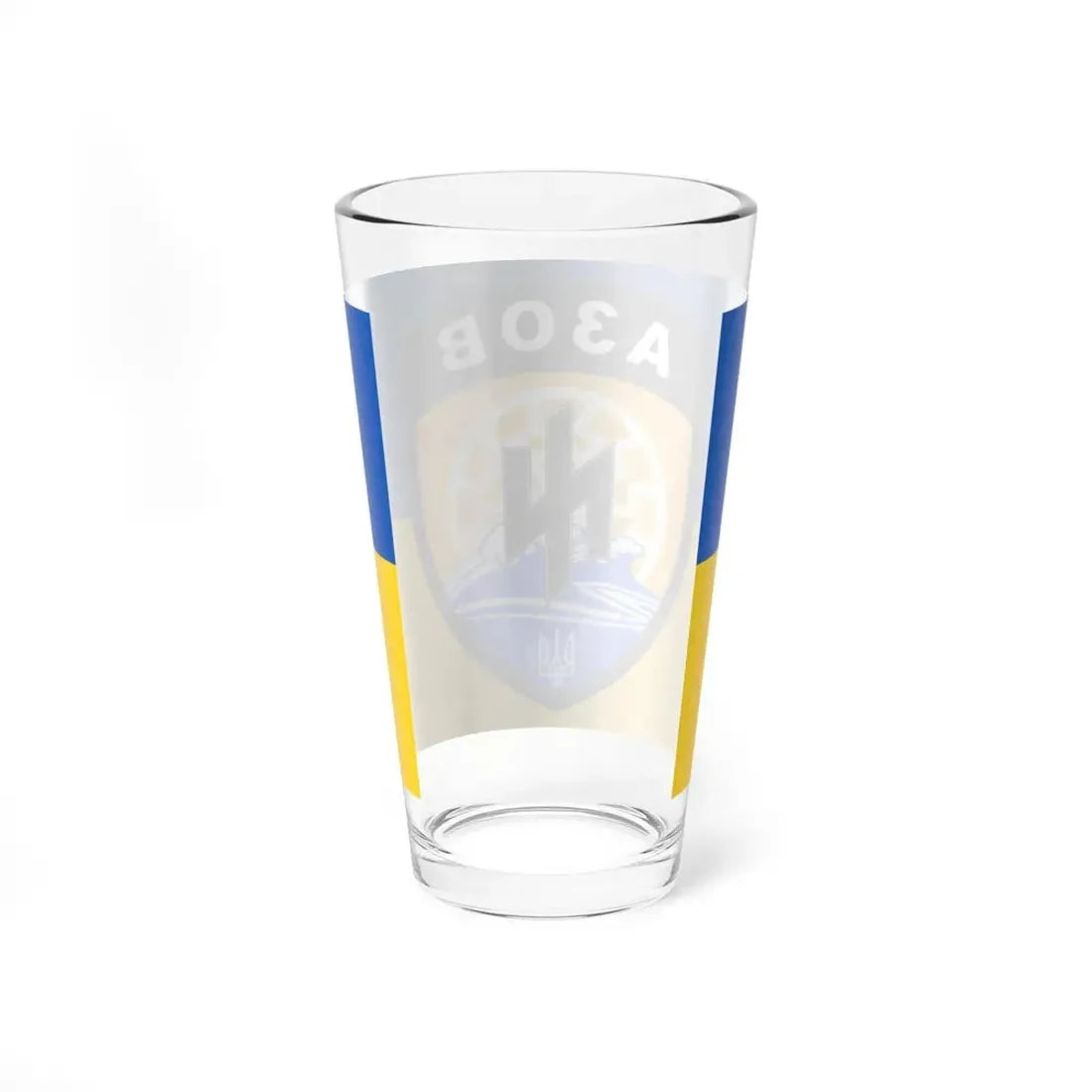 This 16oz pint glass features the distinctive design of the Flag of the Azov Battalion, a military unit within Ukraine's National Guard known for its unique symbolism. The flag, designed in 2014, is emblematic of the battalion's history and values. It depicts a shield divided into three parts: the left side represents Ukraine, the center part showcases a traditional Cossack saber and hammer, symbols of the battalion's military and labor roots, respectively, while the right side represents Donbas, the contested region in eastern Ukraine. This pint glass is perfect for anyone who appreciates unique and cool drinkware, as well as those with an interest in Ukrainian history or symbolism.