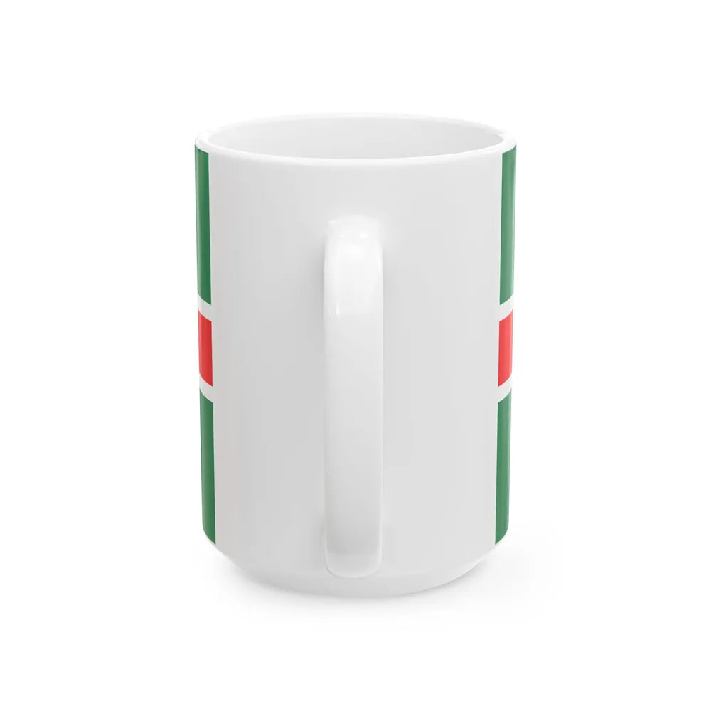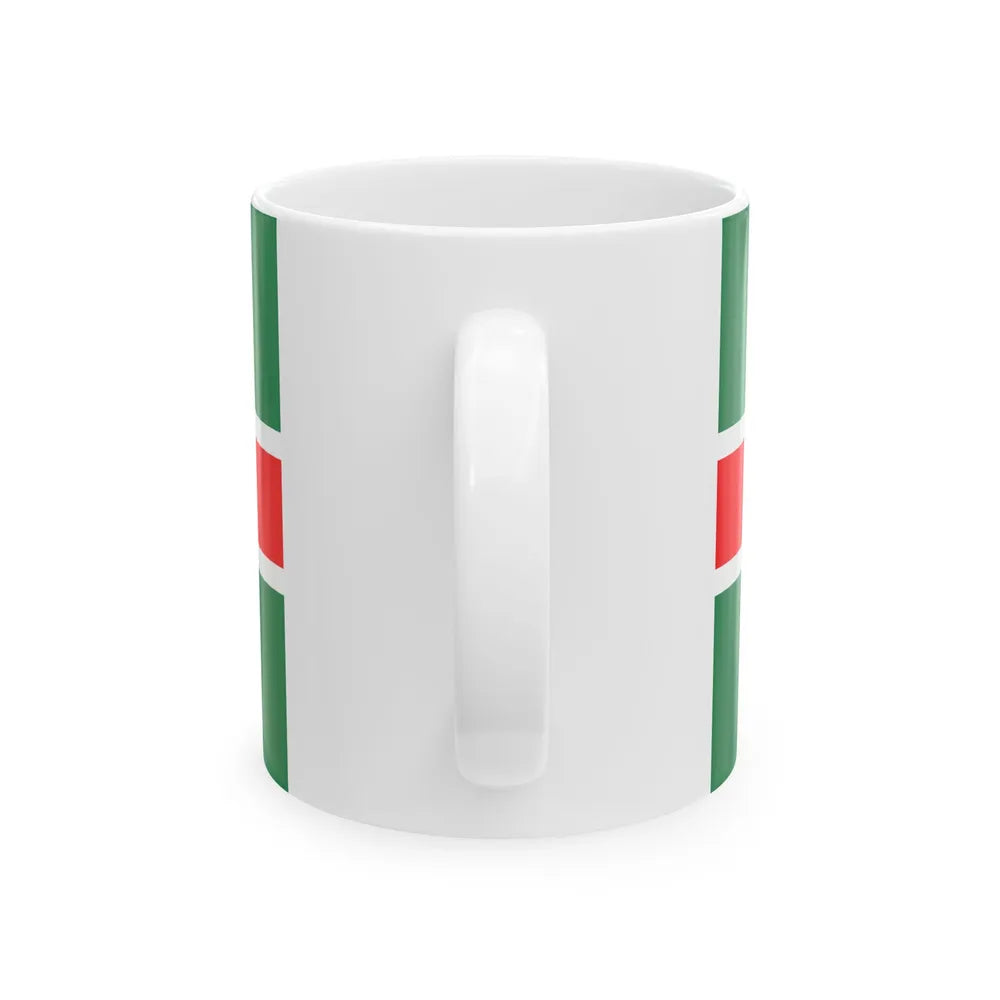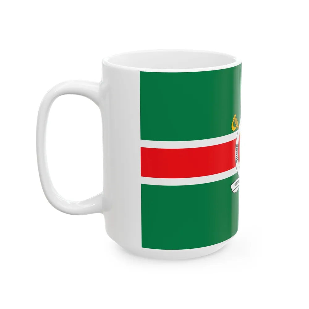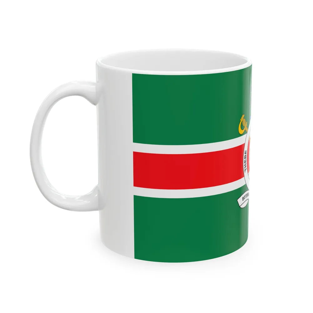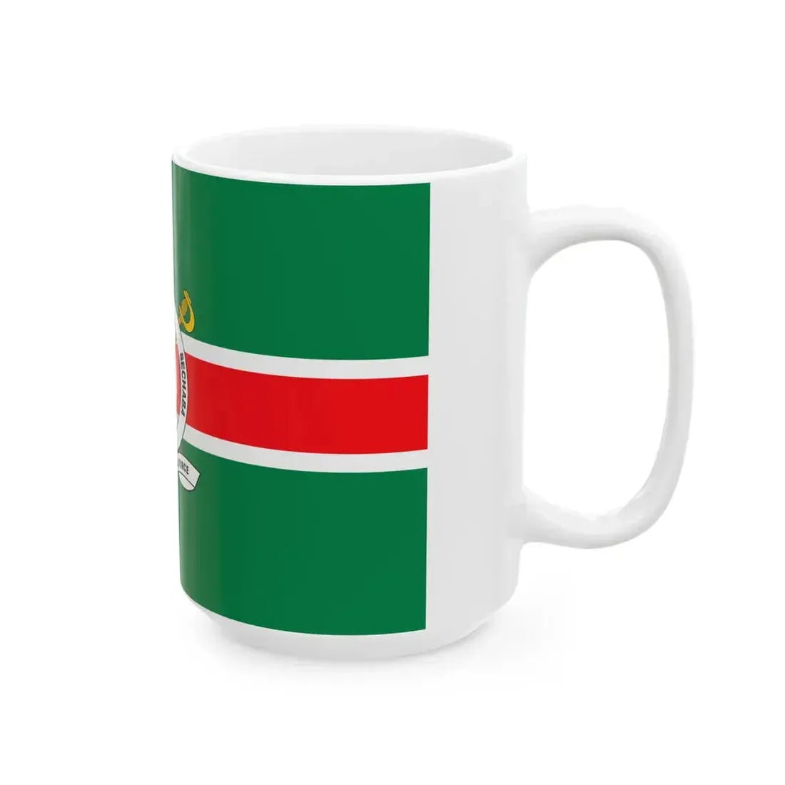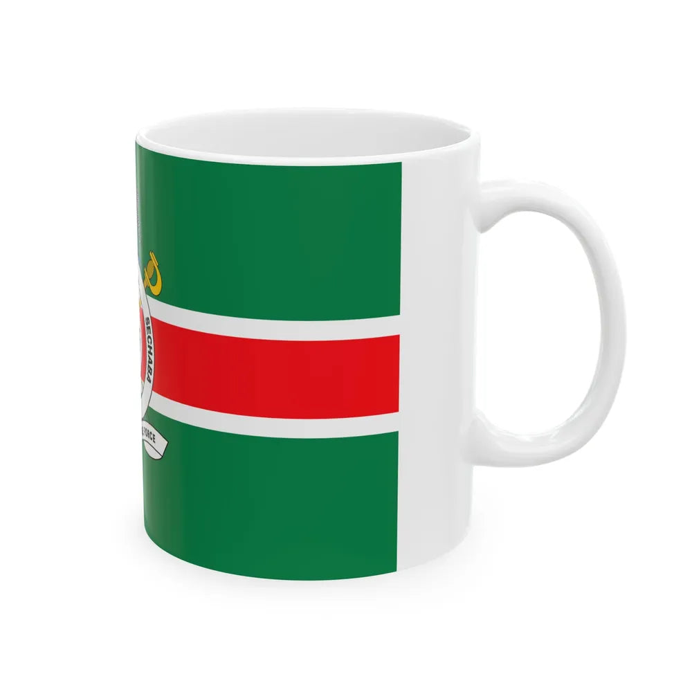 The "Flag of the Botswana Defence Force (Botswana) White Coffee Mug" is a unique piece of merchandise that showcases the symbol of the country's defense force. The mug features an intricate design of the BDF flag, which consists of a shield adorned with various emblems representing Botswana's military values and heritage. The shield is surrounded by a green border, symbolizing the natural vegetation of the country, and topped with a red band, signifying bravery and courage. This coffee mug serves as a tangible reminder of Botswana's rich military history and its commitment to peacekeeping missions. It is perfect for anyone who appreciates unique and cool drinkware, as well as those with an interest in African culture or military history.