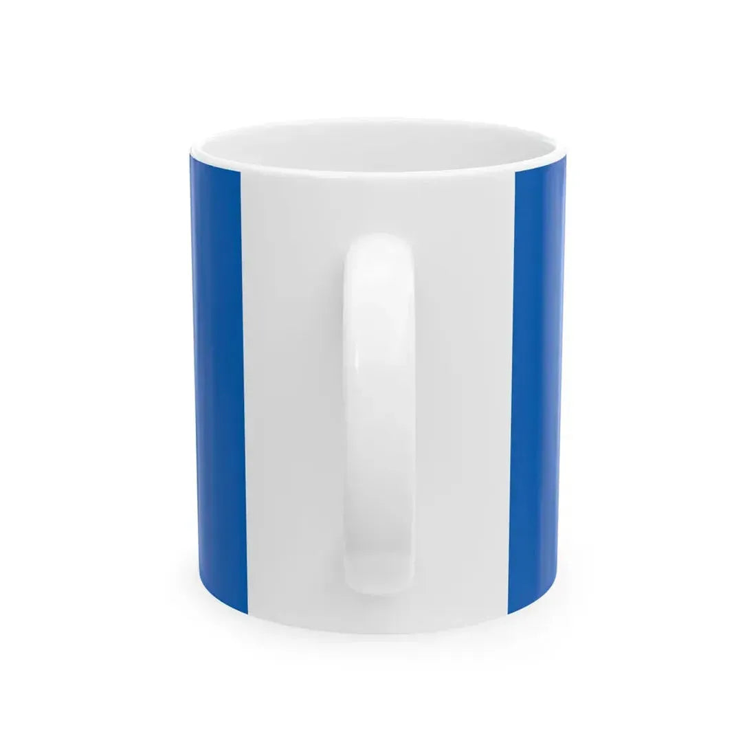 This unique white coffee mug showcases the design inspired by the Flag of the Commissioner of Nunavut, a significant symbol representing Canada's northernmost territory. The flag's distinctive motif, featuring a rectangular field divided diagonally from upper hoist to lower fly, with a maple leaf and inuksuk at the center, is beautifully depicted on this mug. This artful coffee mug is perfect for anyone who appreciates unique and cool drinkware, as well as those with an interest in Canadian geography, history, or culture.
