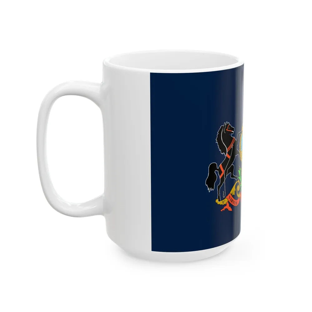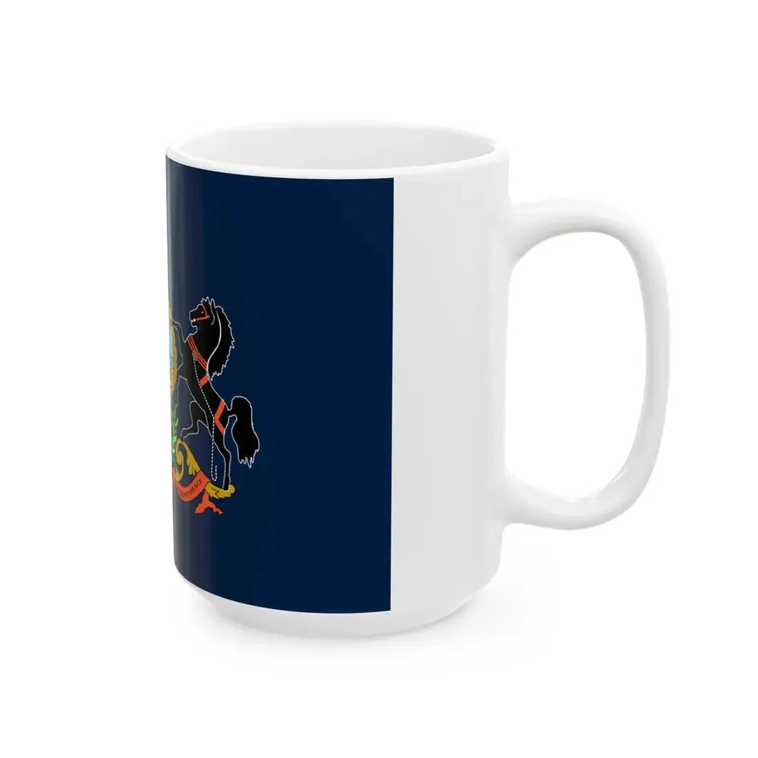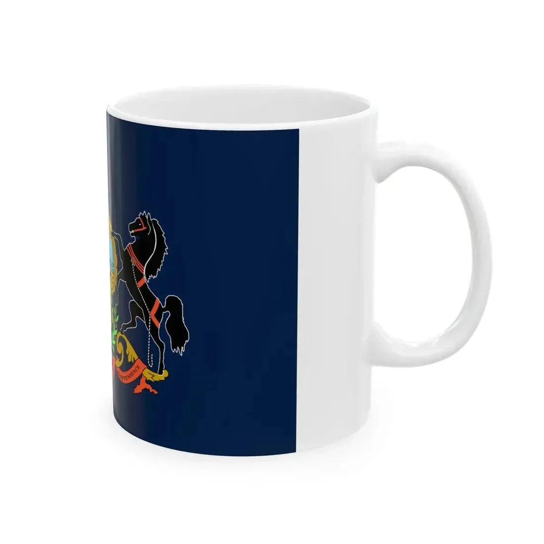 The Flag of the Commonwealth of Pennsylvania White Coffee Mug showcases the official flag of the U.S. state of Pennsylvania, replicated for daily use as a drinkware item. Adopted in 1790, the Pennsylvania flag is unique among American state flags for its simple design consisting of a coat of arms centered on a field of buff (a shade of yellow). The coat of arms features a shield bearing three mullets (five-pointed stars), representing the original counties of Philadelphia, Bucks, and Berks. A broad blue band diagonally across the bottom of the shield represents the Delaware River. This flag design is significant to those with roots in Pennsylvania or history enthusiasts interested in U.S. state symbols.