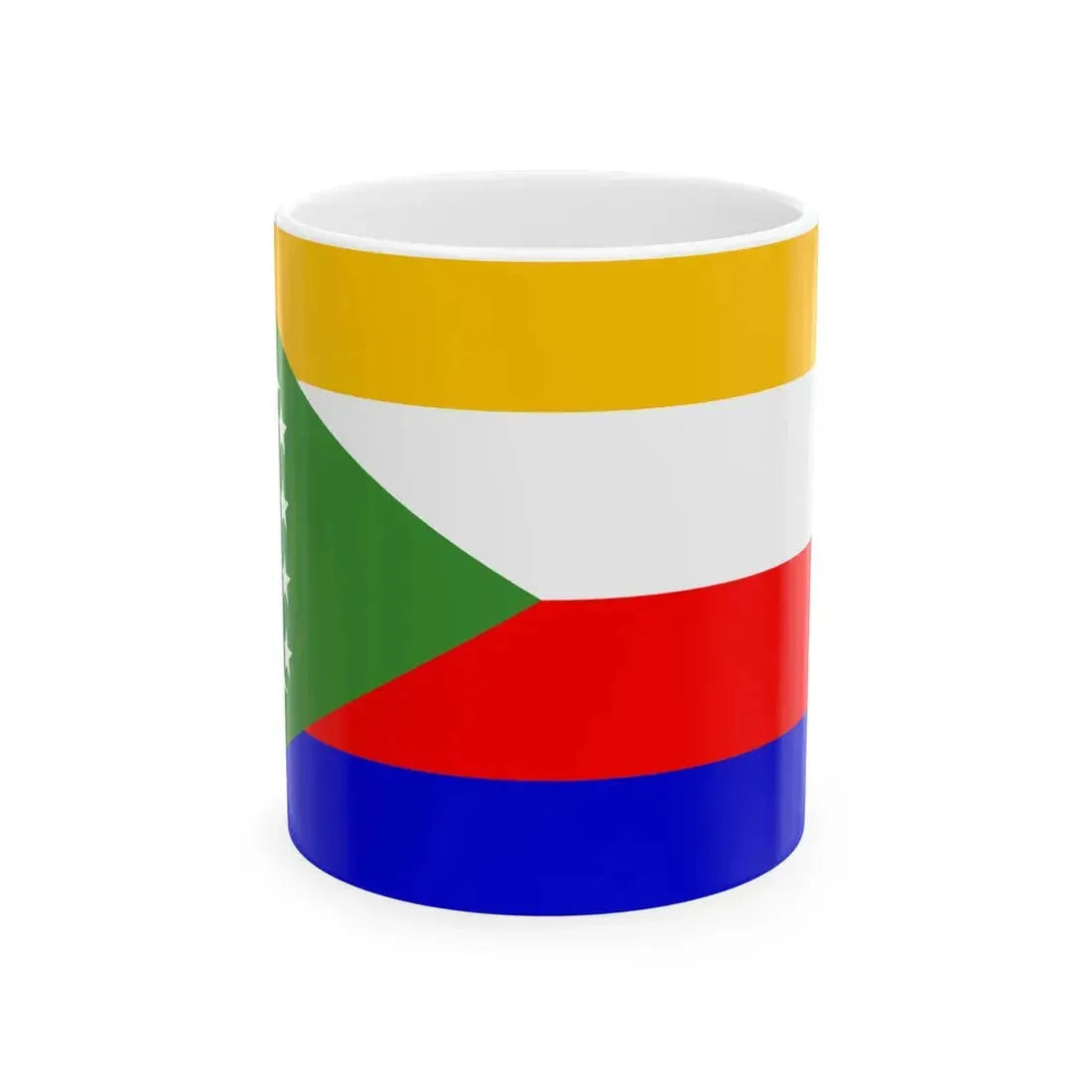 This White Coffee Mug features a design inspired by the Flag of the Comoros, adopted in 2001. The design represents the rich cultural heritage and national identity of this African island nation. The central emblem is a golden star on a red field, symbolizing unity and solidarity among the Comorian people. Surrounding the star are three vertical stripes – green, white, and blue – that represent the environment, peace, and freedom, respectively. This mug serves as a unique piece of artistry, perfect for anyone who appreciates unique and cool drinkware, and also values the culture and history behind each symbol.