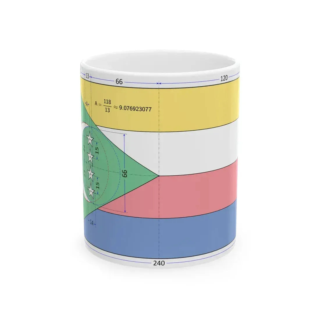 The Flag of the Comoros construction sheet White Coffee Mug is a unique drinkware item that showcases the national flag of the Comoros Islands. This mug, made from ceramic material, features the distinctive design of the Comorian flag, which consists of five vertical stripes in green, white, red, white, and yellow. The flag's symbolism reflects the country's diverse cultural heritage, with each color representing different aspects of the island nation. This mug serves as an excellent representation of national pride for those with a special interest in Comoros or African politics.