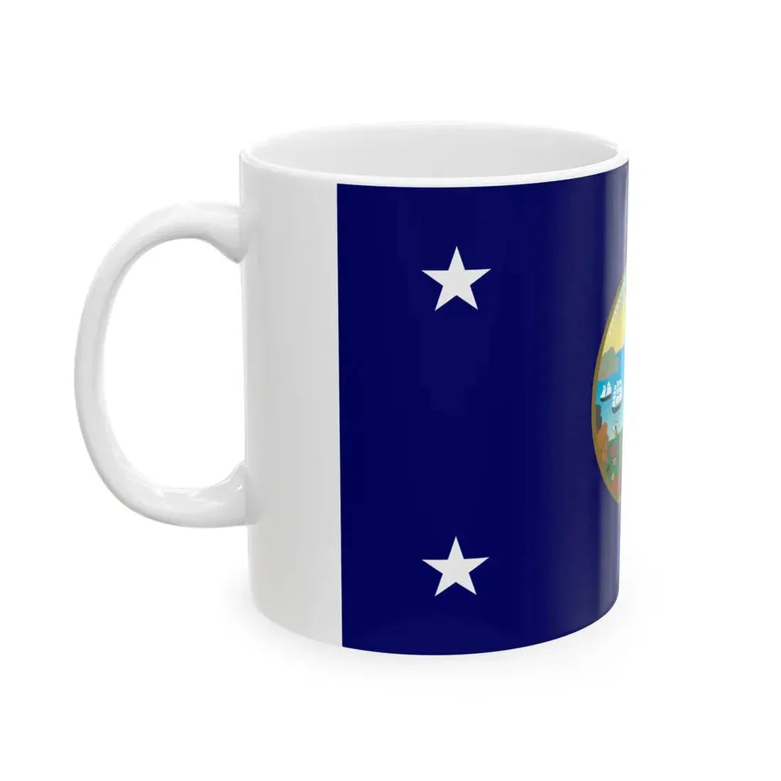 This white coffee mug showcases a design inspired by the Flag of the Governor of California, United States. The flag's distinctive image, featuring a bear standing on its hind legs holding a star, is artfully rendered onto the mug. This design not only serves as an everyday practical item but also as a subtle symbol of one's connection with the rich history and culture of California. Ideal for history enthusiasts, California natives, or anyone who appreciates unique and cool drinkware.