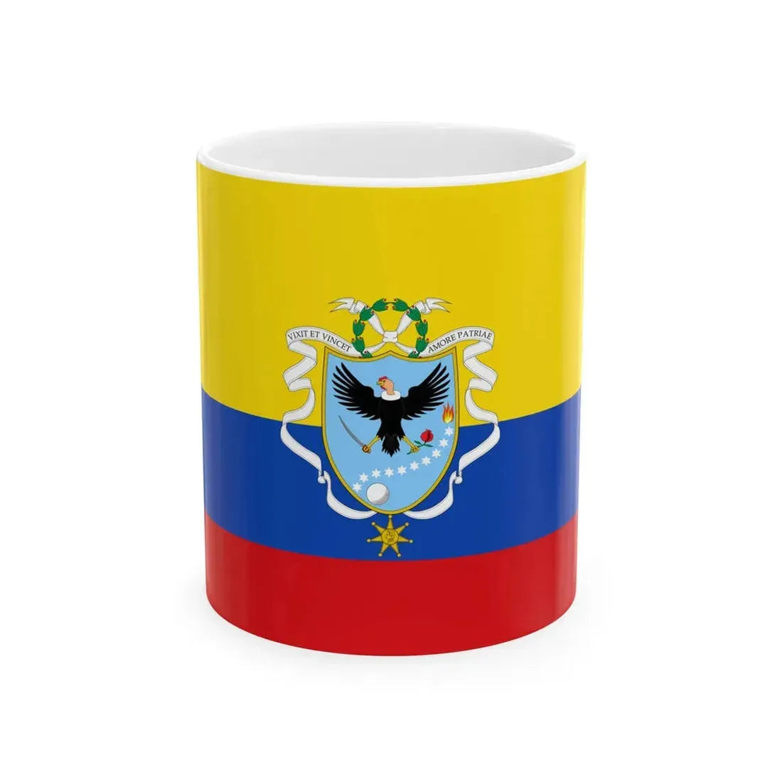 The "Flag of the Gran Colombia 1820-1821 version 2" is a historical artwork emblazoned on this white coffee mug, paying homage to one of the shortest-lived but significant political entities in South America - Gran Colombia. Established in 1819, Gran Colombia was a republic that encompassed present-day Colombia, Panama, Venezuela, and Ecuador. The flag design, which features horizontal stripes of yellow, blue, and red with the coat of arms in the center, symbolizes unity, liberty, and valor - key principles of the early Colombian republic.