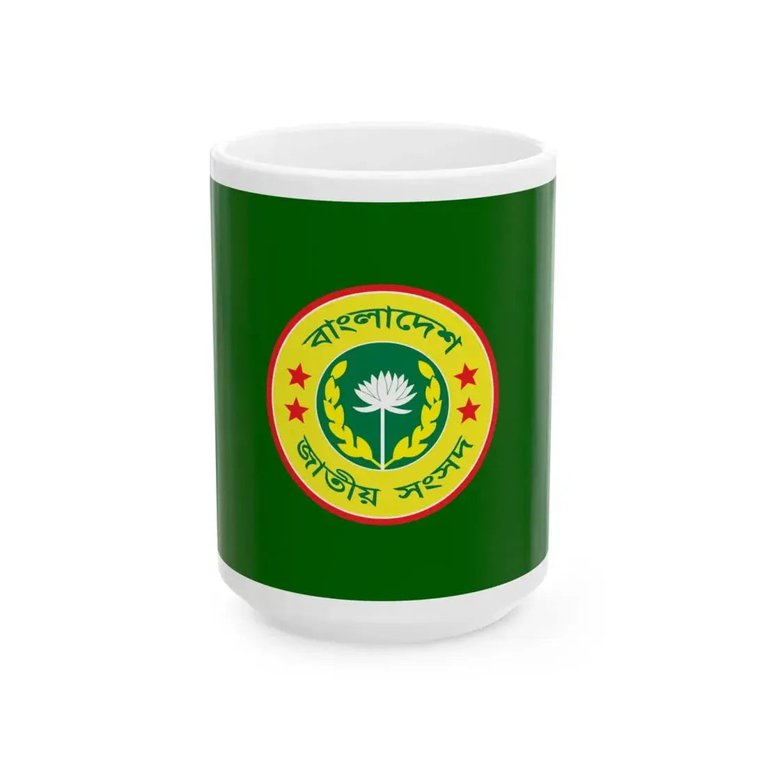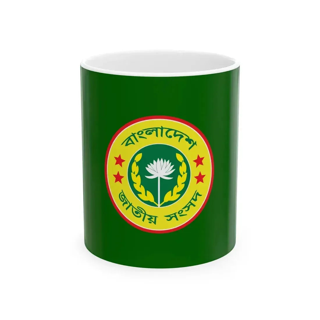The Flag of the Jatiya Sangsad (Bangladesh) White Coffee Mug showcases a unique blend of national symbolism and everyday utility. This white ceramic mug features the design of Bangladesh's national parliament flag, symbolizing political representation and democratic processes. The design consists of a green field with a red disk in the center, representing unity and sovereignty. Surrounding the disk are 24 small white stars, each representing one of the provinces within the country. This mug is perfect for anyone who appreciates unique and cool drinkware, as well as those with an affinity for Bangladesh's history and culture. It makes a thoughtful gift for expatriate Bangladeshis or individuals interested in South Asian politics.