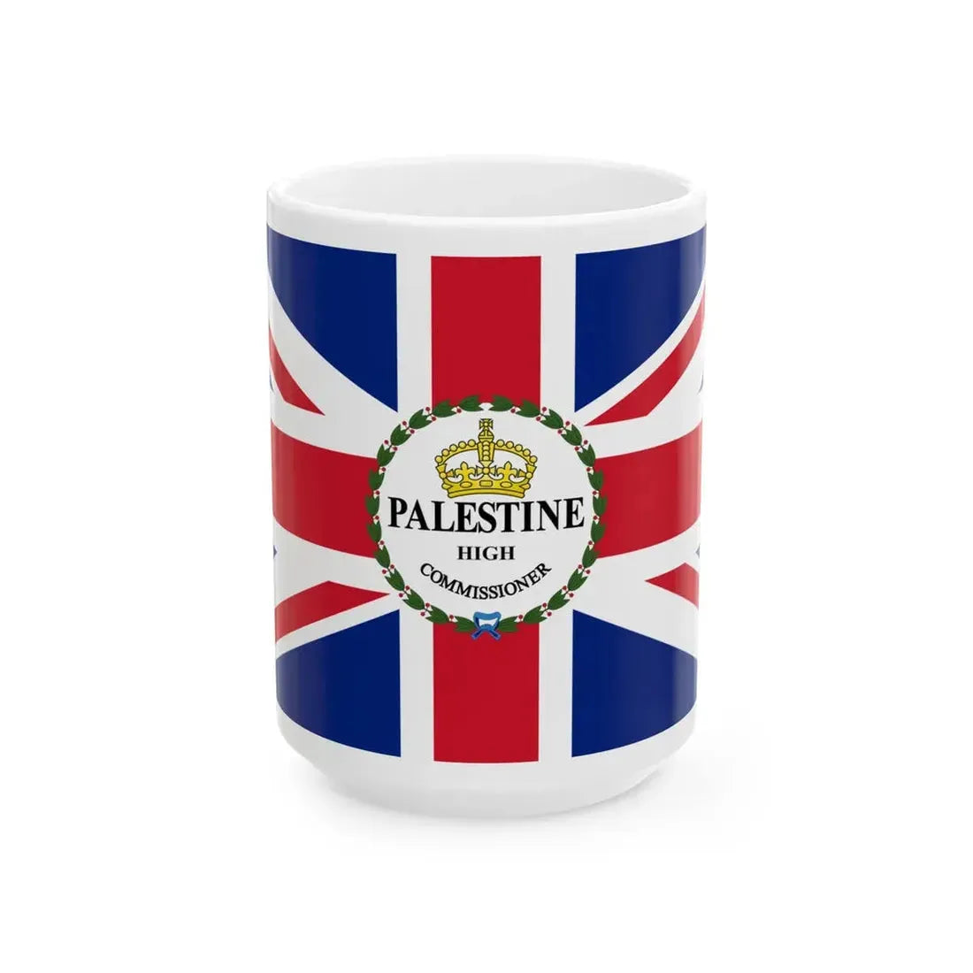 This unique white coffee mug showcases an iconic design โ€“ the flag of the High Commissioner of Palestine (Israel). The flag, a symbol of diplomatic representation, is depicted with its distinctive blue, white, green, and red colors. The flag's design includes a star and olive branches, symbols often associated with peace and hope. This coffee mug is an excellent choice for anyone who appreciates unique and cool drinkware, as well as those interested in world diplomacy or symbolism.