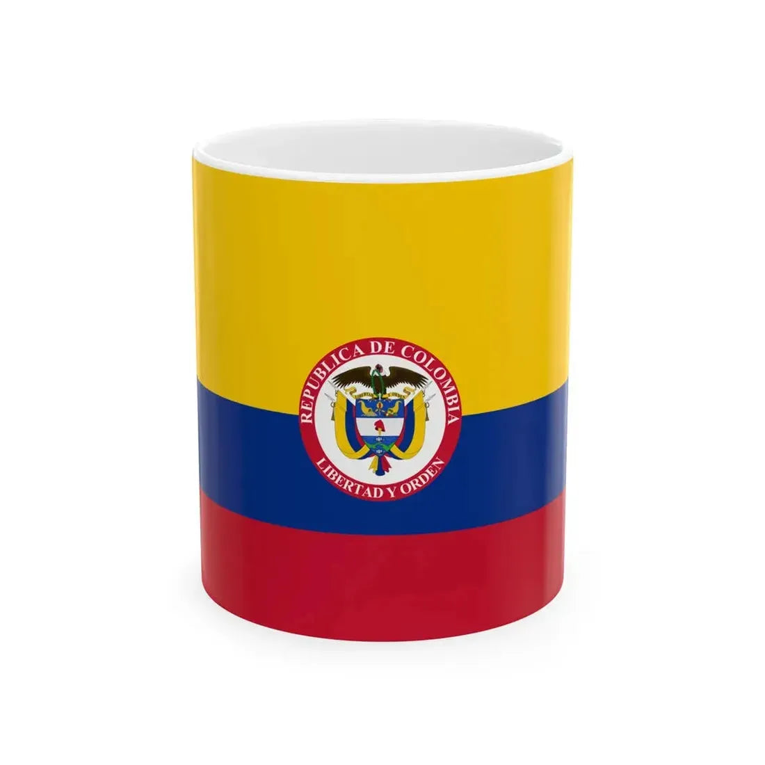 This White Coffee Mug showcases a distinctive design inspired by the Flag of the President of Colombia. The graphic is a symbolic representation of unity, peace, and pride in Colombian heritage. The mug's artwork features three horizontal bands of yellow, blue, and red—colors that represent freedom, the sea, and courage, respectively. The coat of arms of Colombia, consisting of a shield adorned with six stars representing the departments of the country, is strategically placed within the design. This item is perfect for anyone who appreciates unique and cool drinkware, as well as those with an affinity for Colombian culture or patriotism.