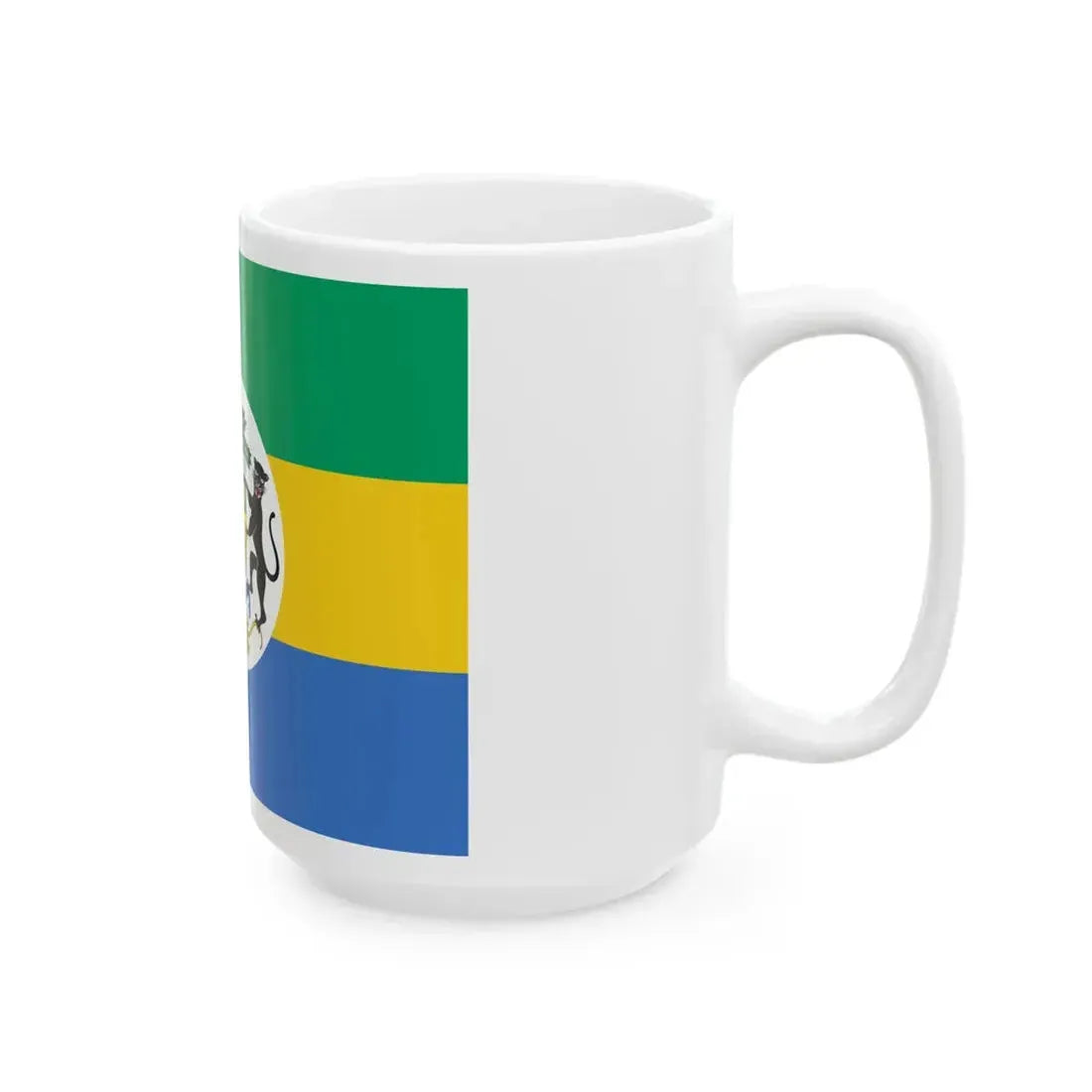 This white coffee mug showcases a unique design inspired by the Flag of the President of Gabon from 1990 to 2016. The flag's central emblem, a star inside a wreath, is depicted prominently, symbolizing unity and strength, key aspects of Gabonese identity. The mug serves as a conversation starter for those who appreciate the rich culture and history of Gabon or African symbolism.