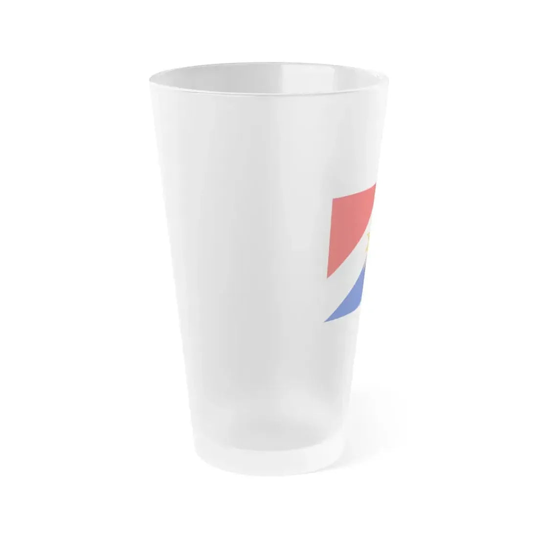 The Puntarenas Province Flag Frosted Pint Glass is a unique piece of drinkware that embodies the spirit of Costa Rica's coastal region, Puntarenas. This 16oz glass showcases the official flag design of the province, which features three horizontal stripes in blue, white, and red, symbolizing peace, purity, and courage, respectively. The flag also displays a gold five-pointed star in the upper hoist-side corner, representing unity. This pint glass is ideal for those who appreciate Costa Rican culture or have a connection to Puntarenas, making it perfect for anyone who appreciates unique and cool drinkware.