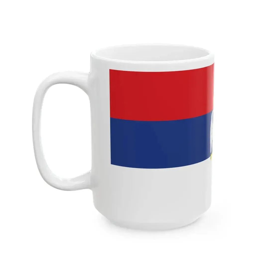 This White Coffee Mug showcases a graphic that represents the Flag of The Republic of Serbian Krajina, a historical political entity in Croatia. The design includes six horizontal stripes, alternating between red and white, symbolizing courage and bravery. At the hoist fly is a blue field representing the sky with a five-pointed white star, signifying freedom and unity. This mug is perfect for anyone who appreciates unique and cool drinkware, as well as history enthusiasts who have an interest in the Balkan region or the events of the 1990s.