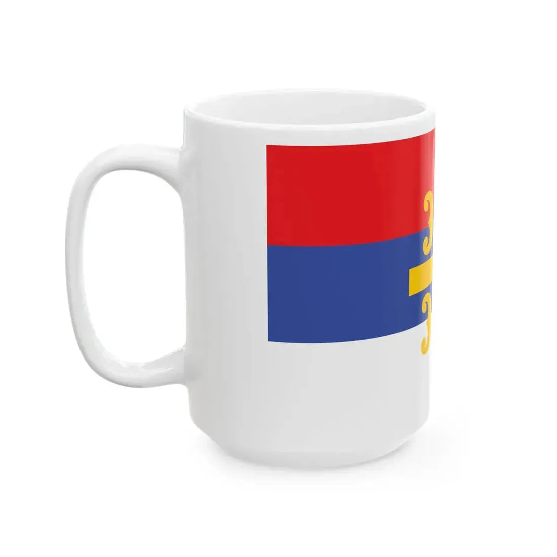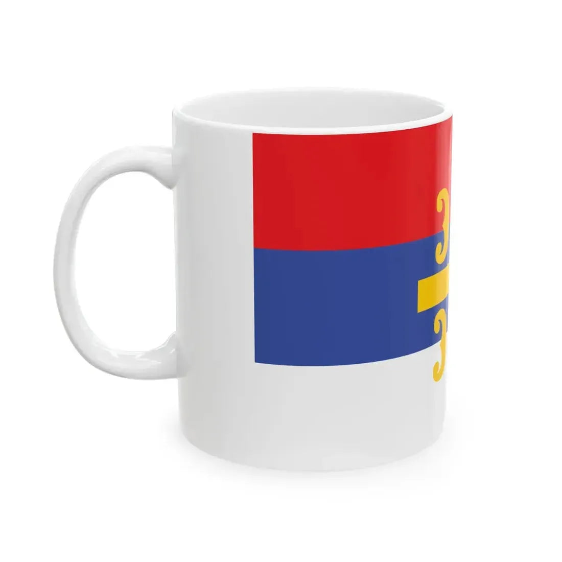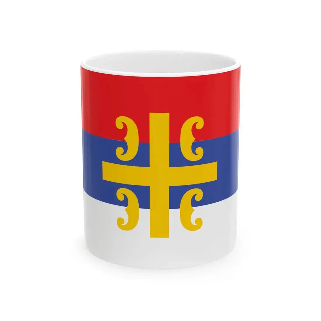 This White Coffee Mug showcases a design inspired by the unofficial flag of Republika Srpska, a political entity within Bosnia and Herzegovina. The flag's distinctive symbolism is recreated on this mug, making it an intriguing piece for anyone with a keen interest in the Balkan region's history or culture. The design features six interwoven red, blue, and white stripes, symbolizing unity, strength, and peace among its people. A golden-yellow, double-headed eagle, representing the historical medieval Serbian Empire, stands proudly at the center. This mug is not just a functional drinking vessel but also serves as a conversation starter about the rich history of Republika Srpska. Perfect for anyone who appreciates unique and cool drinkware.