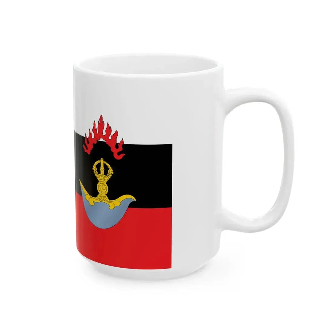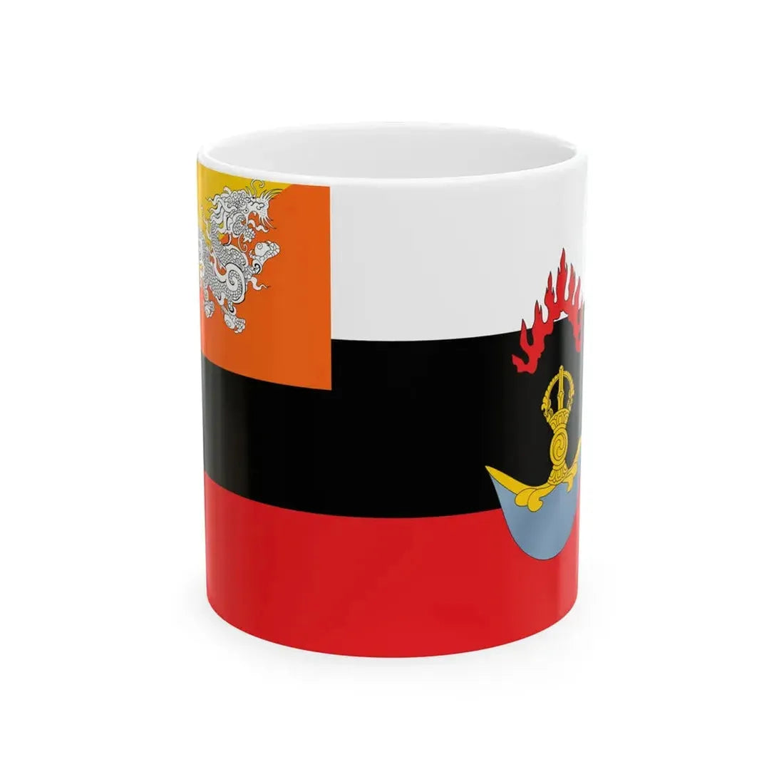 This white coffee mug showcases a design inspired by the Flag of the Royal Bhutan Army. The symbolism in this flag is rich and significant to Bhutanese culture. The yellow Druk, or dragon, in the center represents strength and power, while the red-and-white checkered border signifies the unity of the four corners of Bhutan. By using this mug, you are not just enjoying your favorite beverage; you're embracing a piece of Bhutanese heritage and military history. Perfect for anyone who appreciates unique and cool drinkware, especially those with an interest in Asian culture, world flags, or the armed forces.