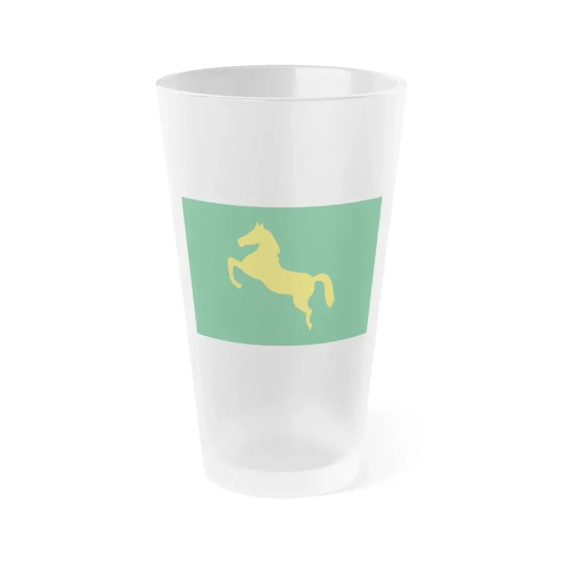 Frosted pint glass (16 oz / ≈0.47 L) with a soft matte finish and semi-translucent, one-sided print. Tough enough for bar and restaurant use, dishwasher safe, and BPA-free — a modern take on classic pintware.