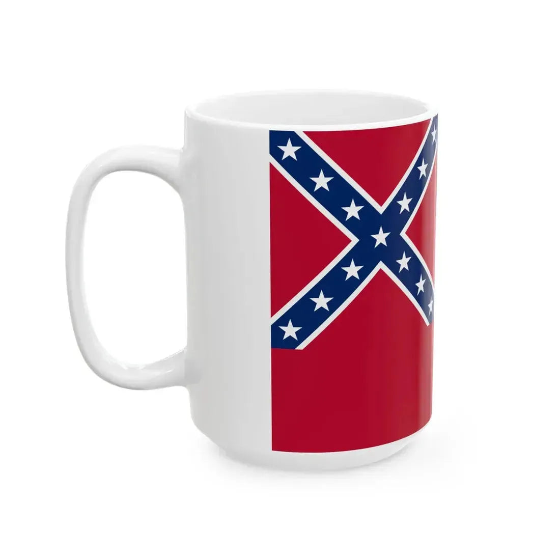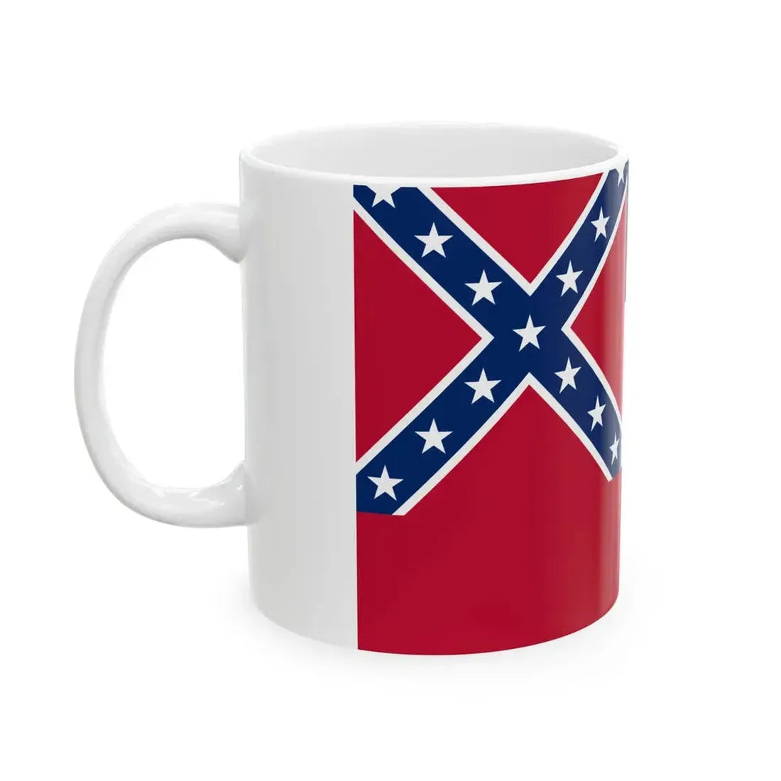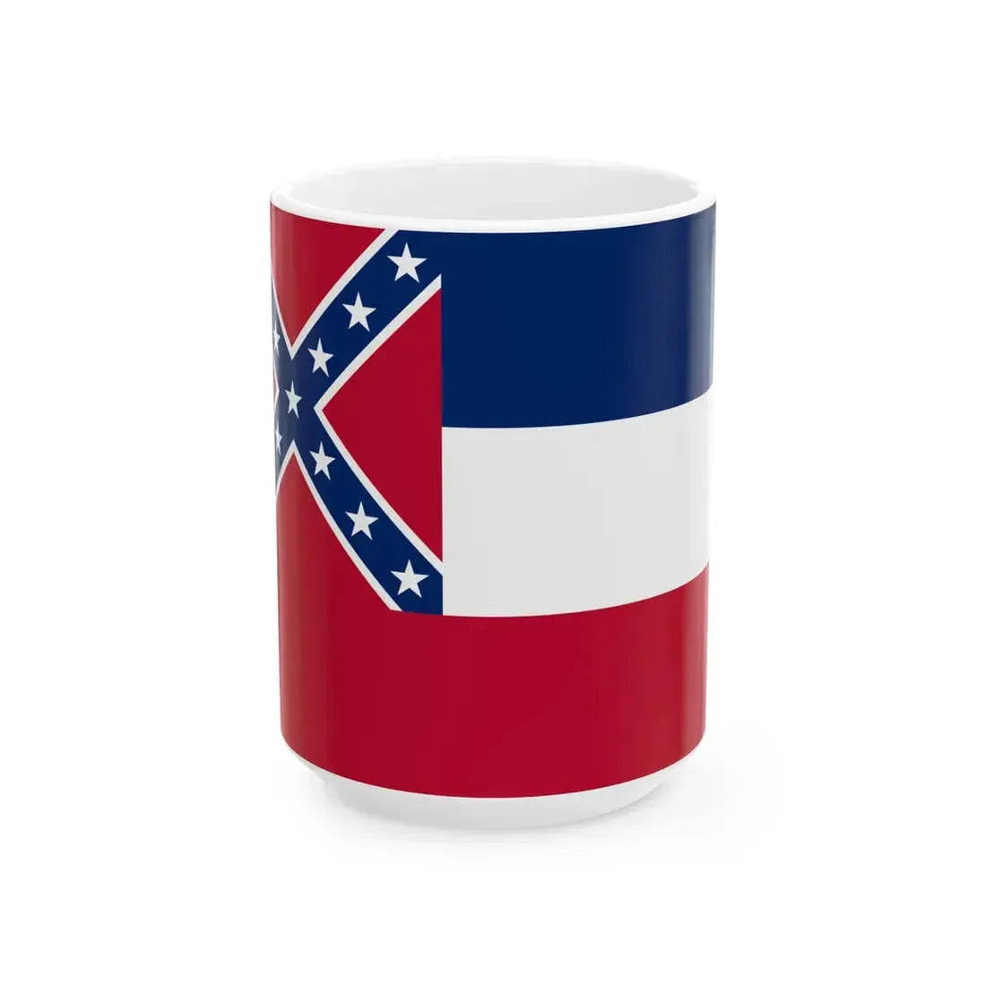 This White Coffee Mug features a historic design based on the Flag of the State of Mississippi from 1894 to 1906. The flag design includes the Mississippi seal, centered within a field of white stars arranged in an X pattern over a red field. At the top and bottom of the flag are the words "In God We Trust" in blue letters, while at the left and right sides are white letters spelling out "The Great Seal of the Mississippi Territory." This mug is perfect for anyone who appreciates unique and cool drinkware and has an interest in American history, particularly the history of the State of Mississippi.