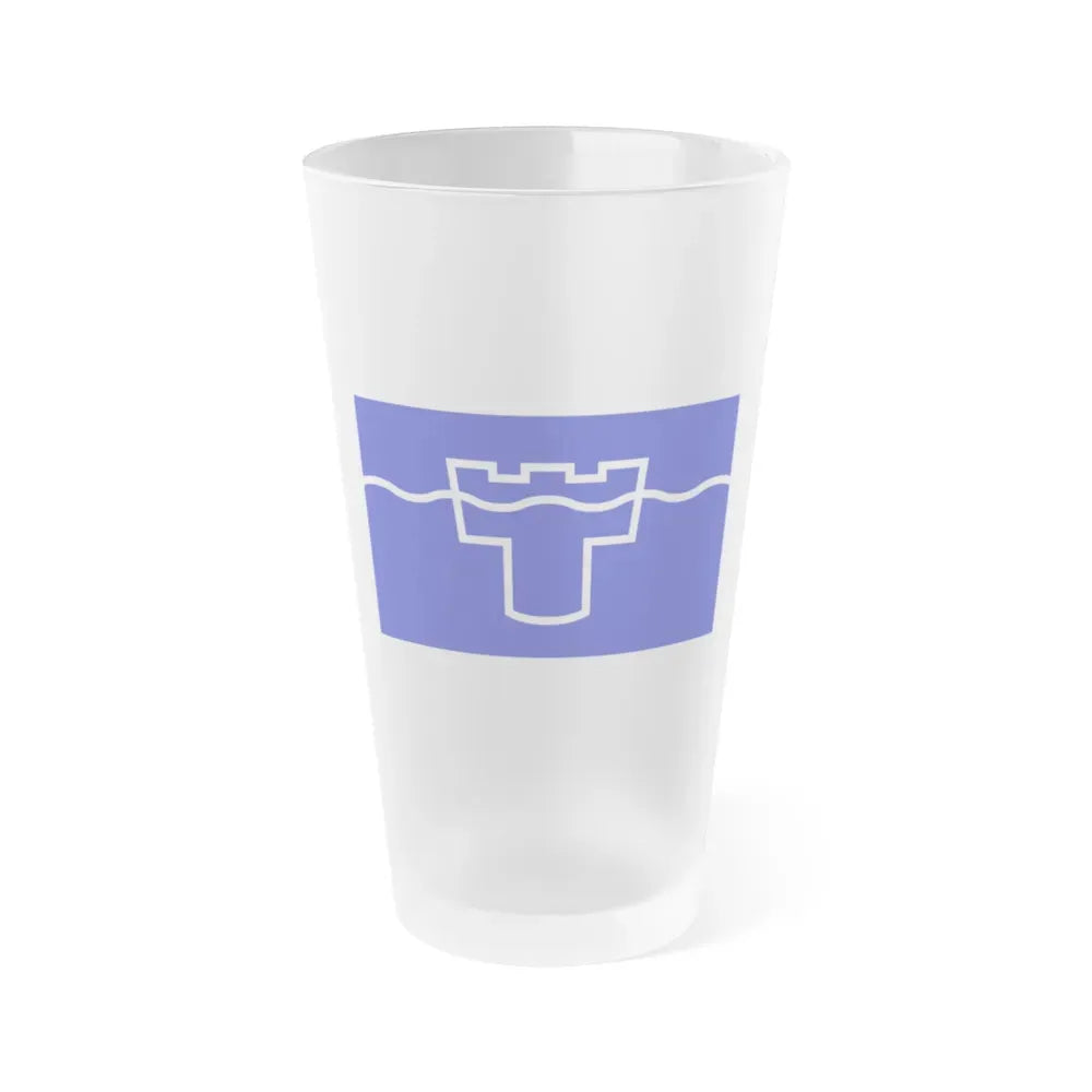 Frosted pint glass (16 oz / ≈0.47 L) with a soft matte finish and semi-translucent, one-sided print. Tough enough for bar and restaurant use, dishwasher safe, and BPA-free — a modern take on classic pintware.
