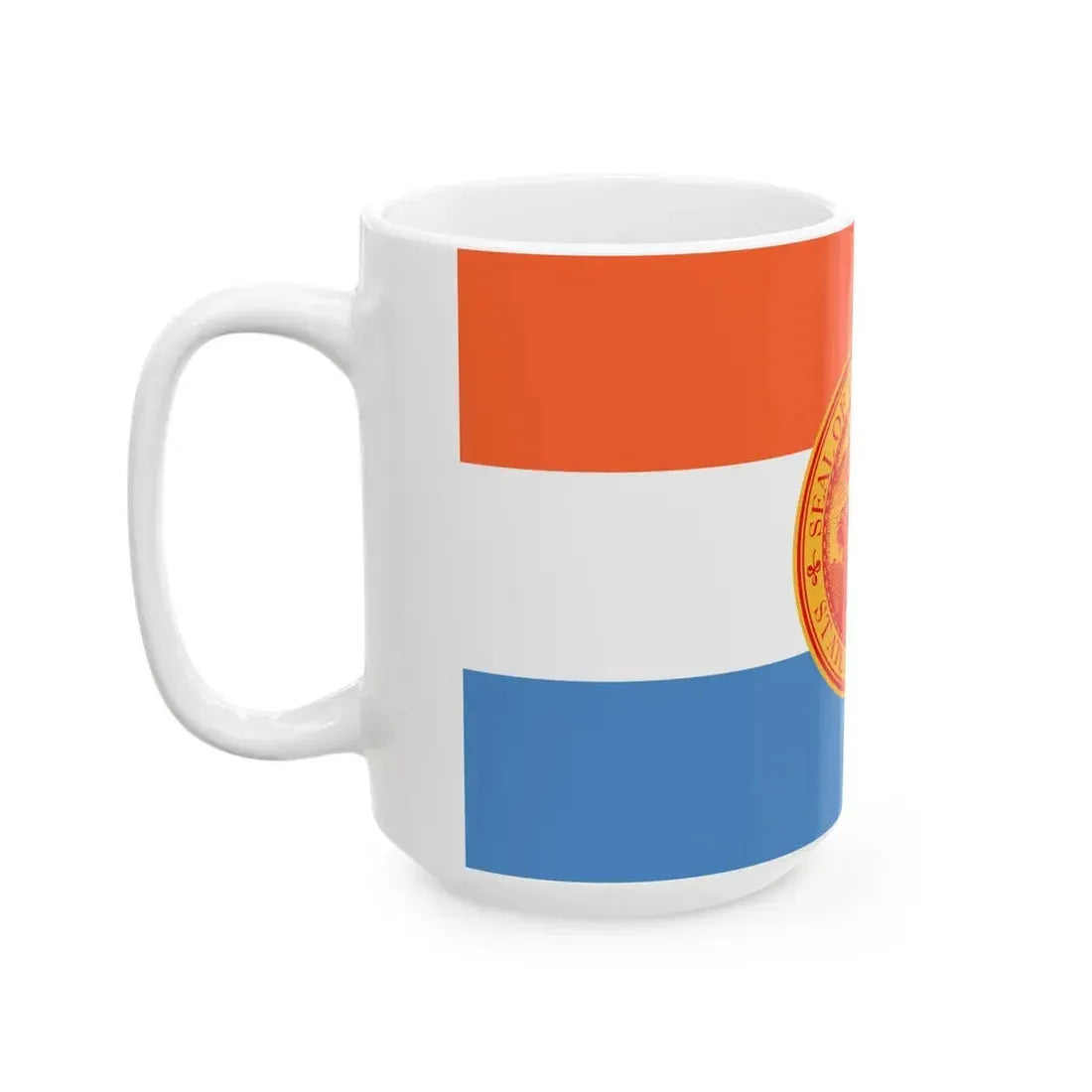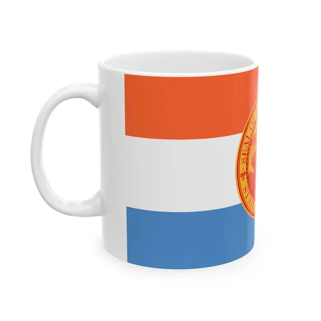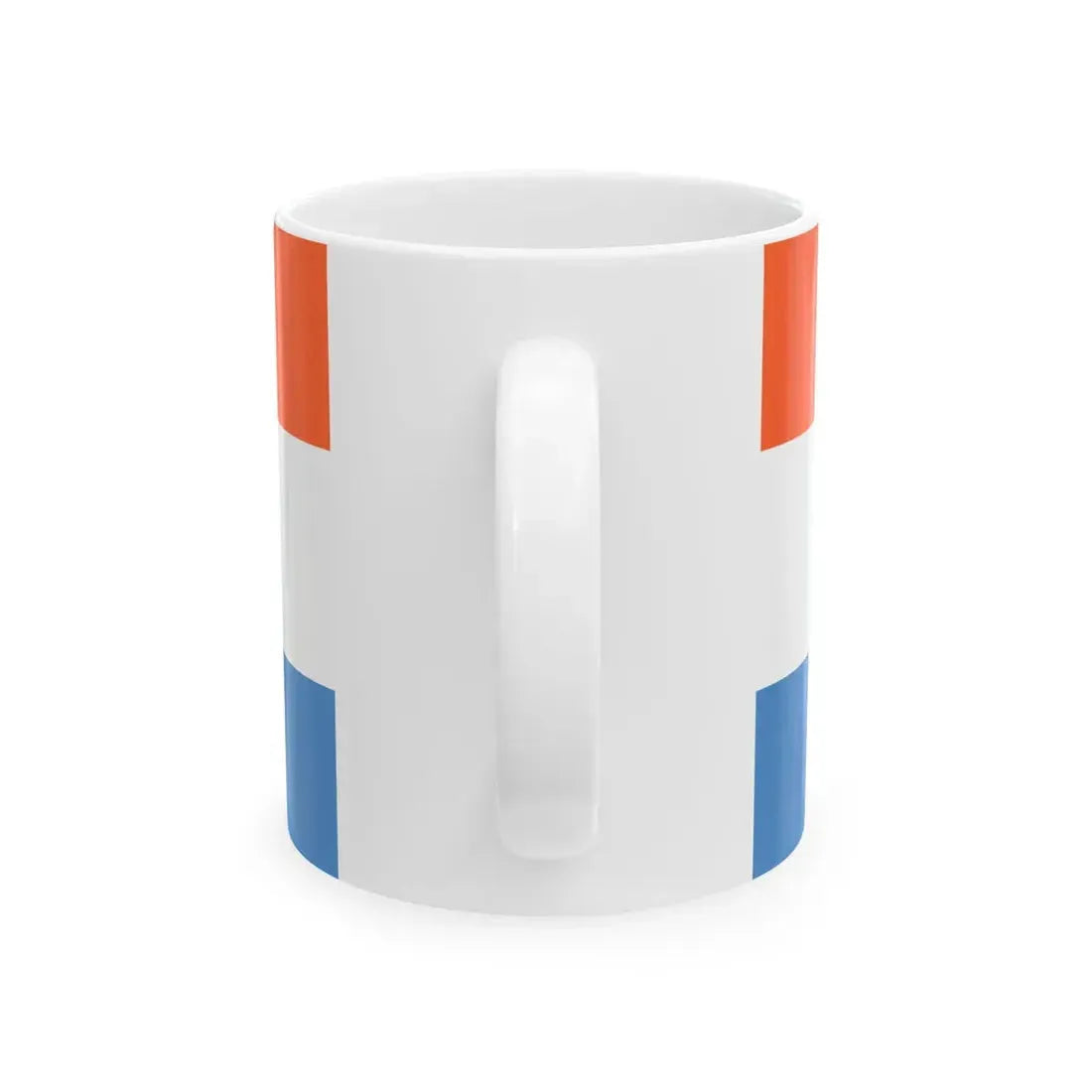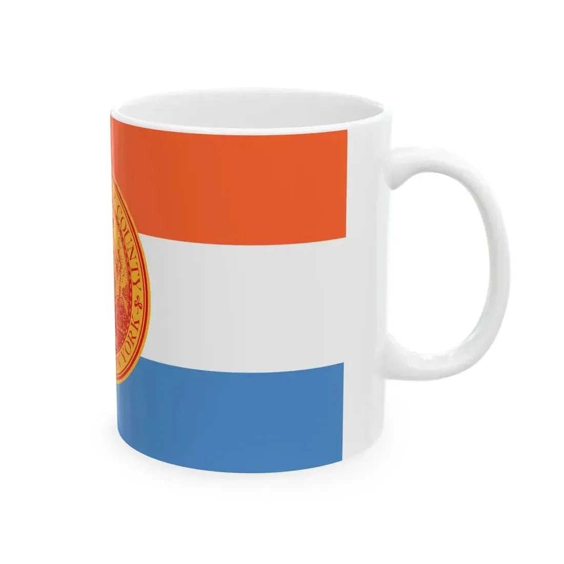 This white coffee mug showcases the design inspired by the Flag of Ulster County, New York. The flag features a blue field with three white stars in a vertical line in the upper hoist-side corner, representing the original counties of Ulster, Orange, and Dutchess. A red saltire (an X-shaped cross) divides the remaining area into four quarters, symbolizing the four towns that were part of the county at its formation in 1683. This unique drinkware is perfect for anyone who appreciates American history or has a special connection to Ulster County.