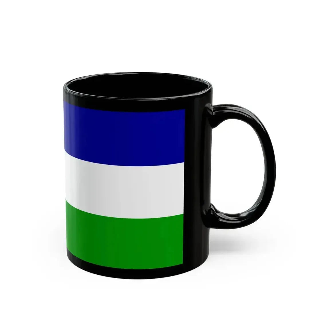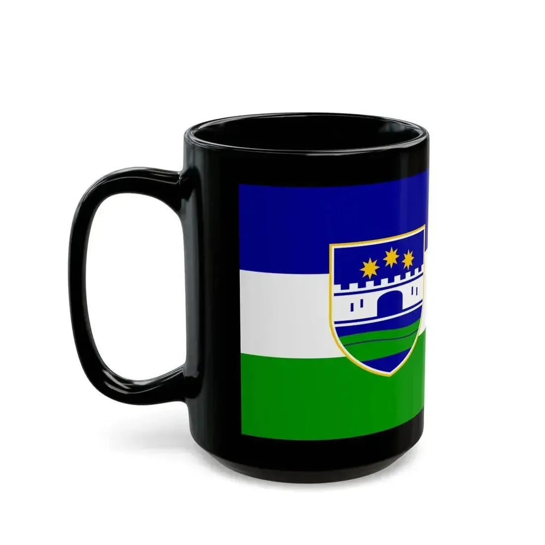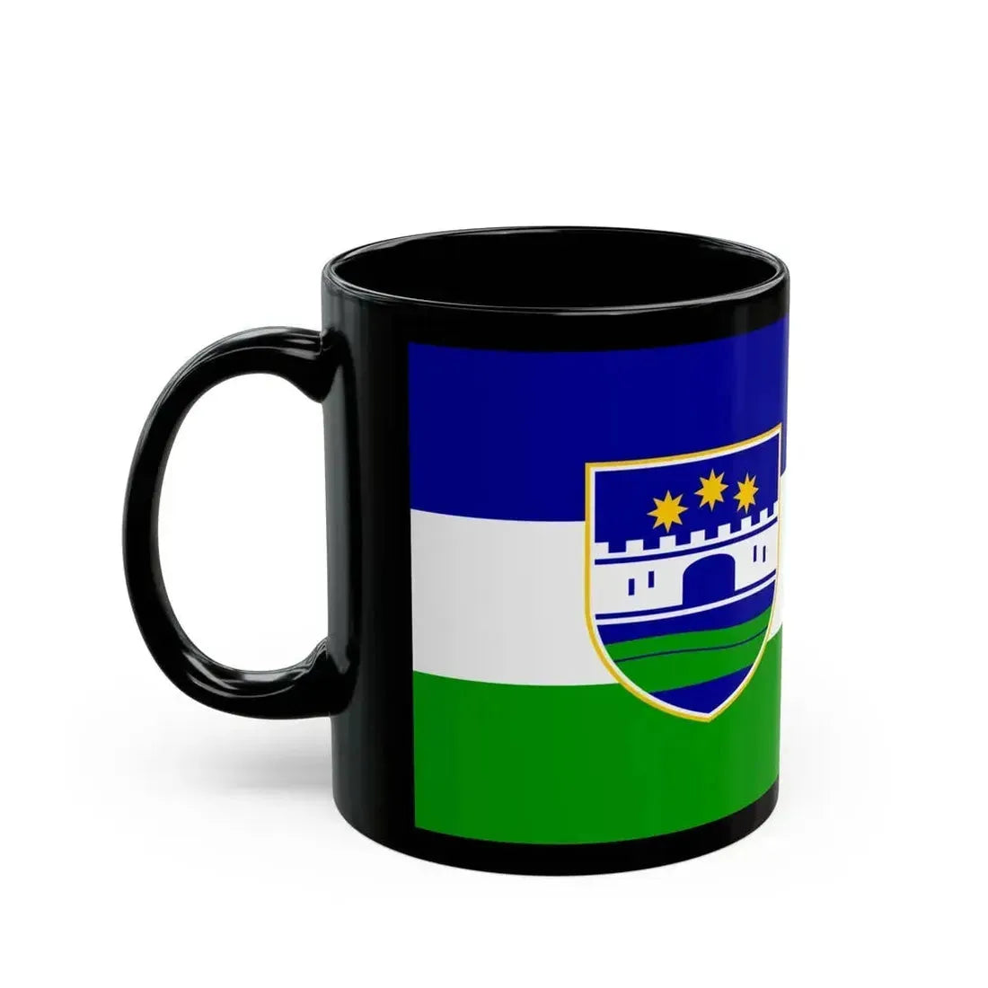 This black coffee mug showcases the Flag of Una-Sana Canton, a regional entity in Bosnia and Herzegovina. The design on this mug features the canton's official flag, which is divided into three horizontal bands of green, red, and blue, with a yellow five-pointed star at the center of the blue band. The Flag of Una-Sana Canton symbolizes unity, resilience, and history, making it an excellent choice for anyone who appreciates Bosnian culture or has ties to the region.