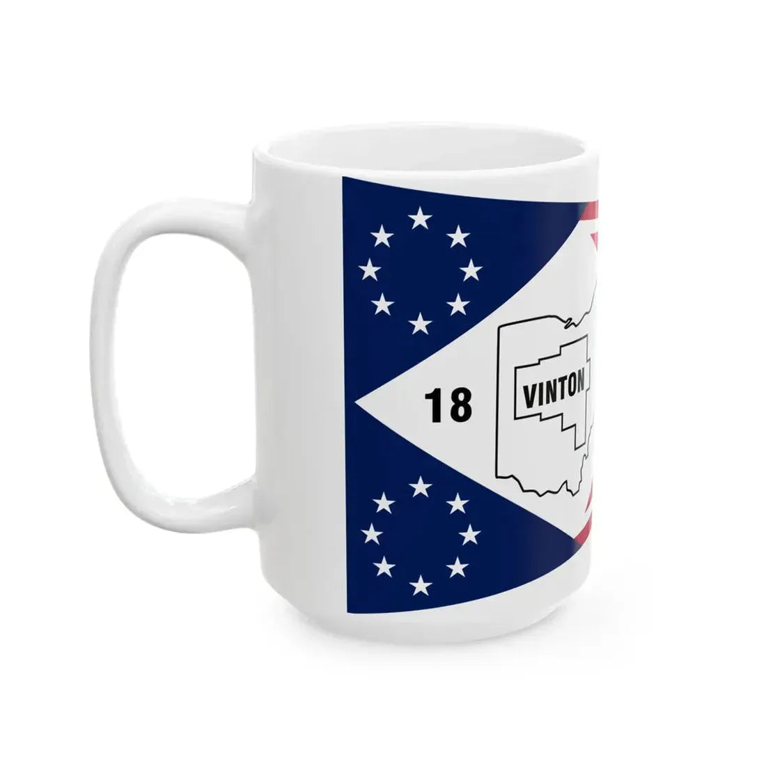 The Flag of Vinton County Ohio mug showcases a unique and distinctive design, inspired by the official flag of this picturesque county in the state of Ohio, United States. The mug features the county's official seal, which includes a bald eagle perched on a shield, symbolizing strength, courage, and protection. This design is surrounded by green pine trees, representing the lush, natural beauty of Vinton County. The flag's motto, "Progress Through Unity," is also elegantly displayed on the mug. Ideal for anyone who appreciates unique and cool drinkware, this mug makes a for locals or history enthusiasts with an affinity for Ohio county symbols.