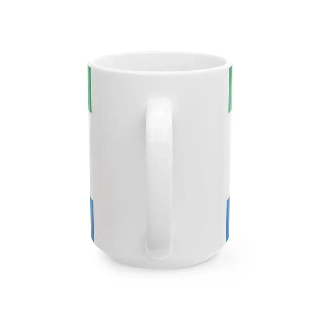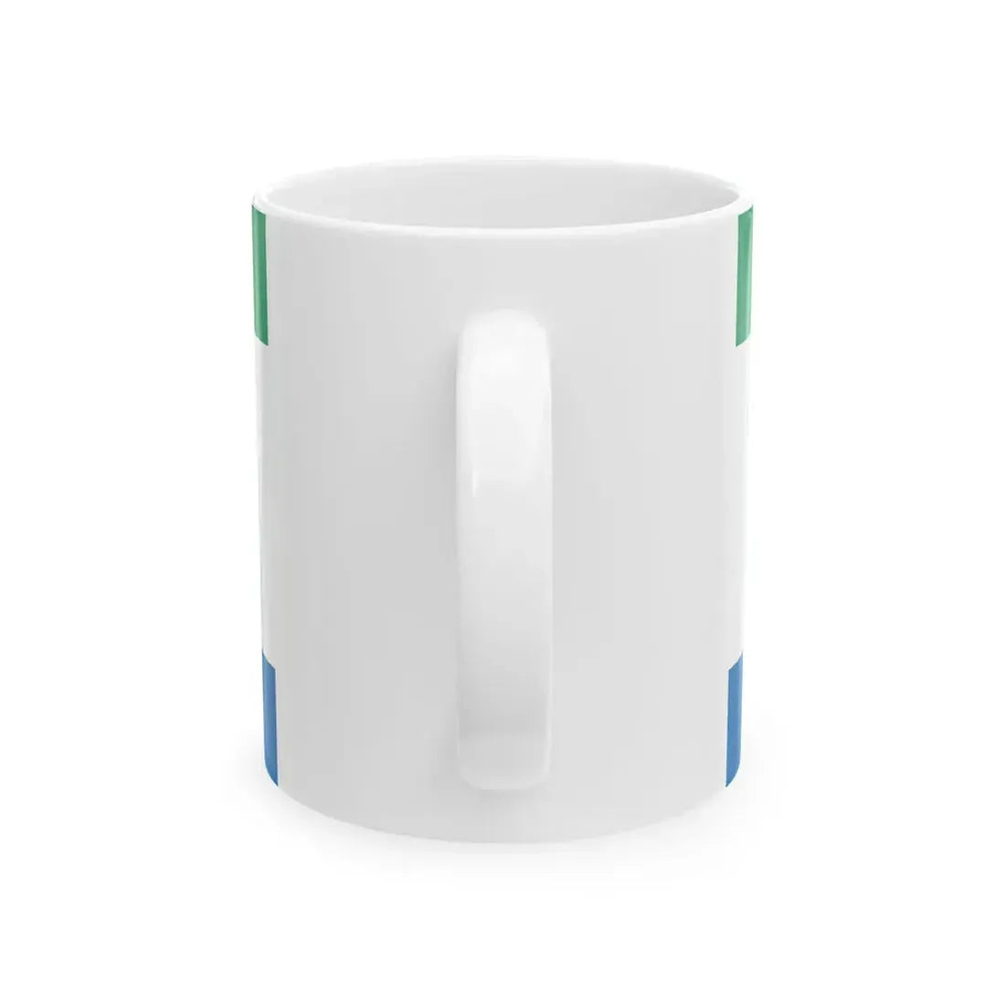 This unique white coffee mug showcases the Flag of West Memphis, Arkansas (United States) as its design. The flag, adopted in 2013, features a navy blue field with a central gold star representing the state's status as a "First State" to join the Union. Surrounding the star are five gold arrows pointing outwards symbolizing the city's strategic location at the confluence of the Mississippi and St. Francis Rivers.