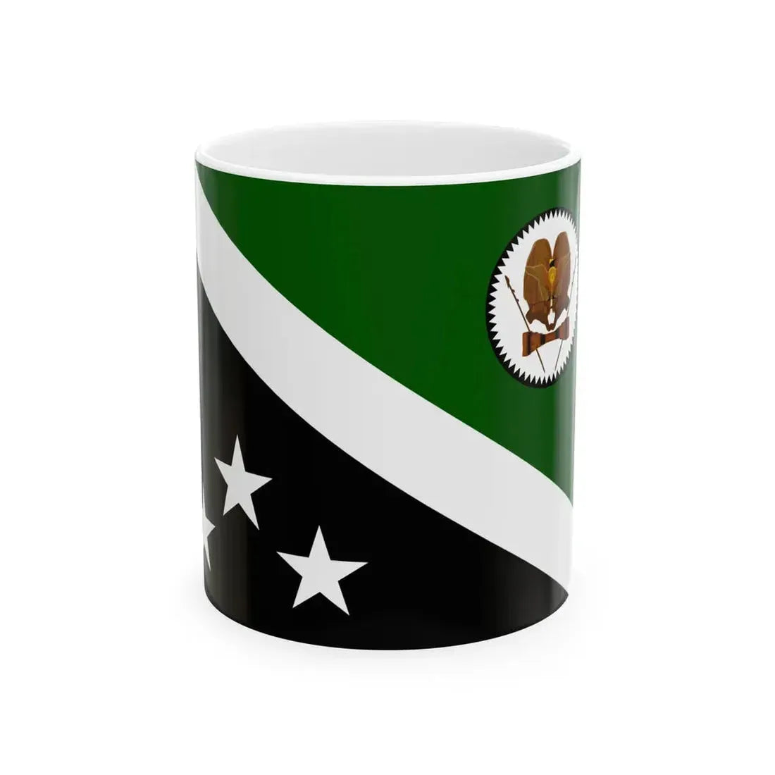 This White Coffee Mug showcases a design inspired by the Flag of Western Highlands Province in Papua New Guinea. The artwork features vibrant green fields, symbolizing the lush landscape of the region, with intricate tribal patterns overlaid on it. The mug celebrates the rich culture and heritage of Western Highlands, making it a perfect conversation starter for those interested in Pacific Island art and anthropology.