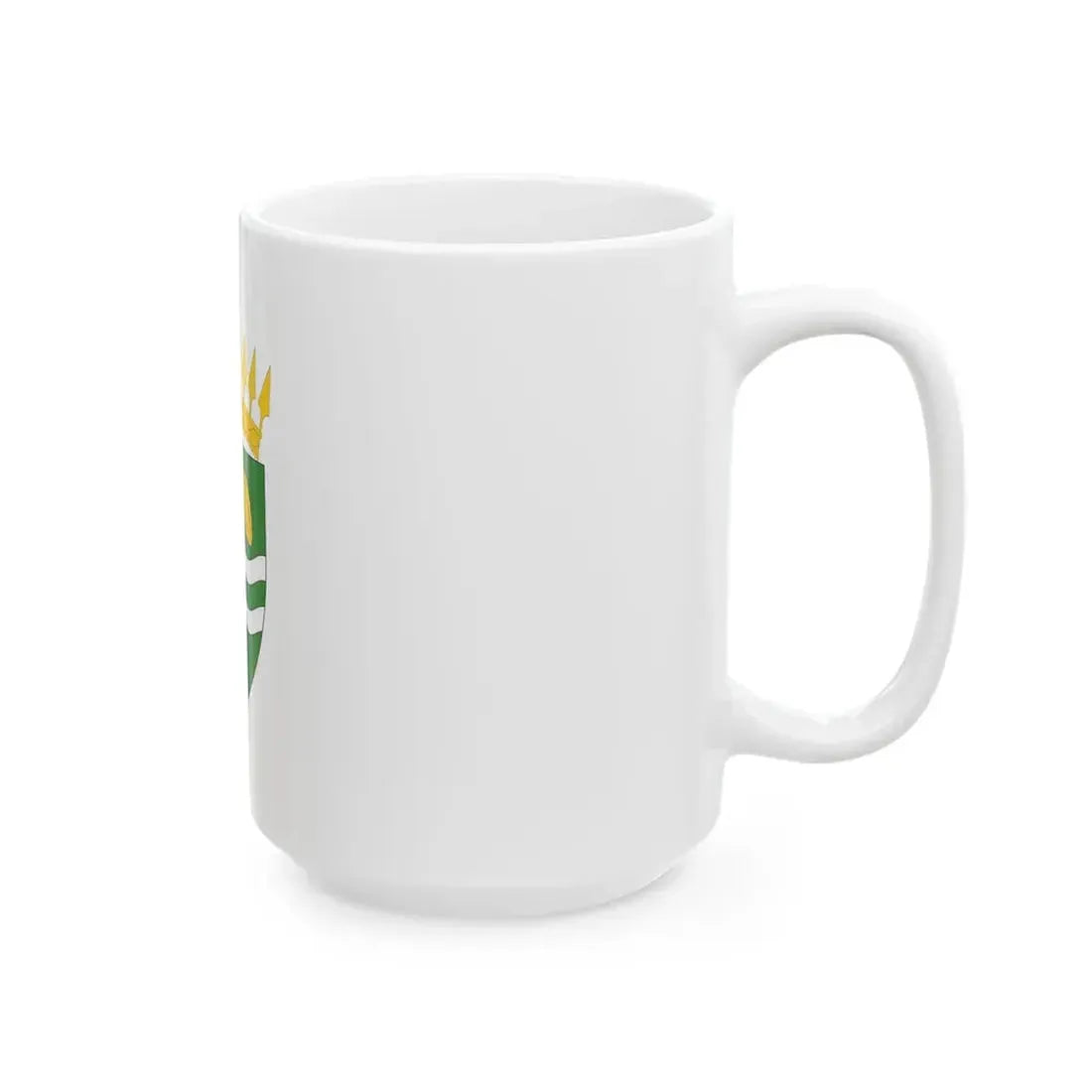 The "Flag of Woleu-Ntem Province Gabon White Coffee Mug" showcases a unique design inspired by the national flag of Gabon's Woleu-Ntem province. This region, located in western Gabon, is recognized for its rich biodiversity and the Lopé-Okanda National Park, a UNESCO World Heritage Site. The mug's artwork reflects the official provincial flag's design, featuring three horizontal bands in green, yellow, and red, with a black stylized eagle at the center.