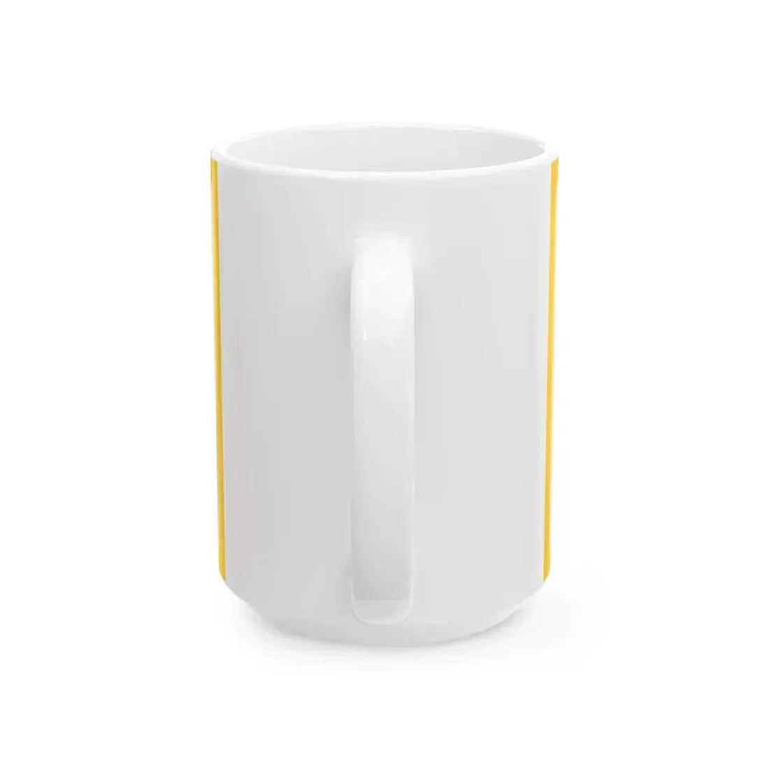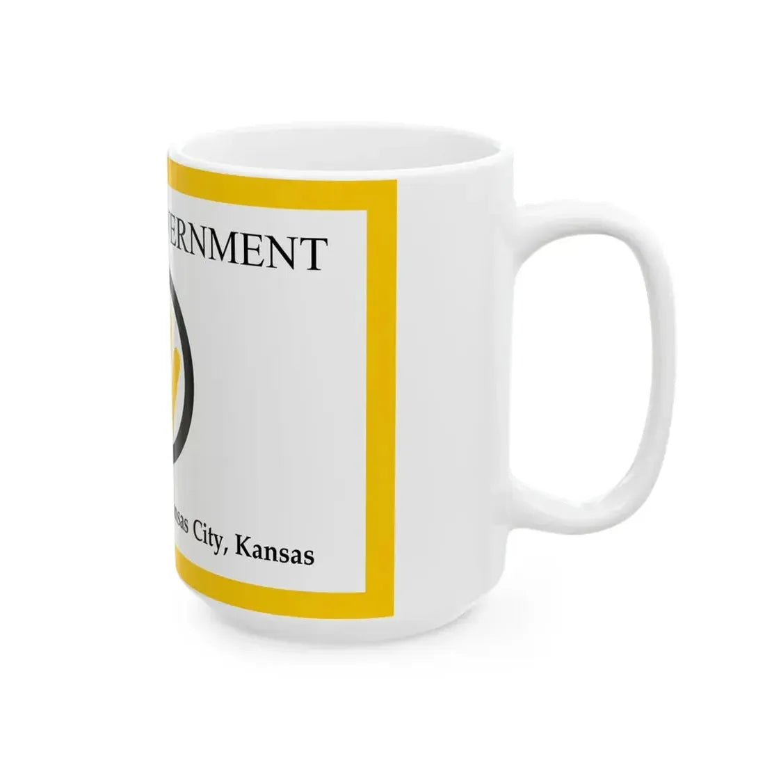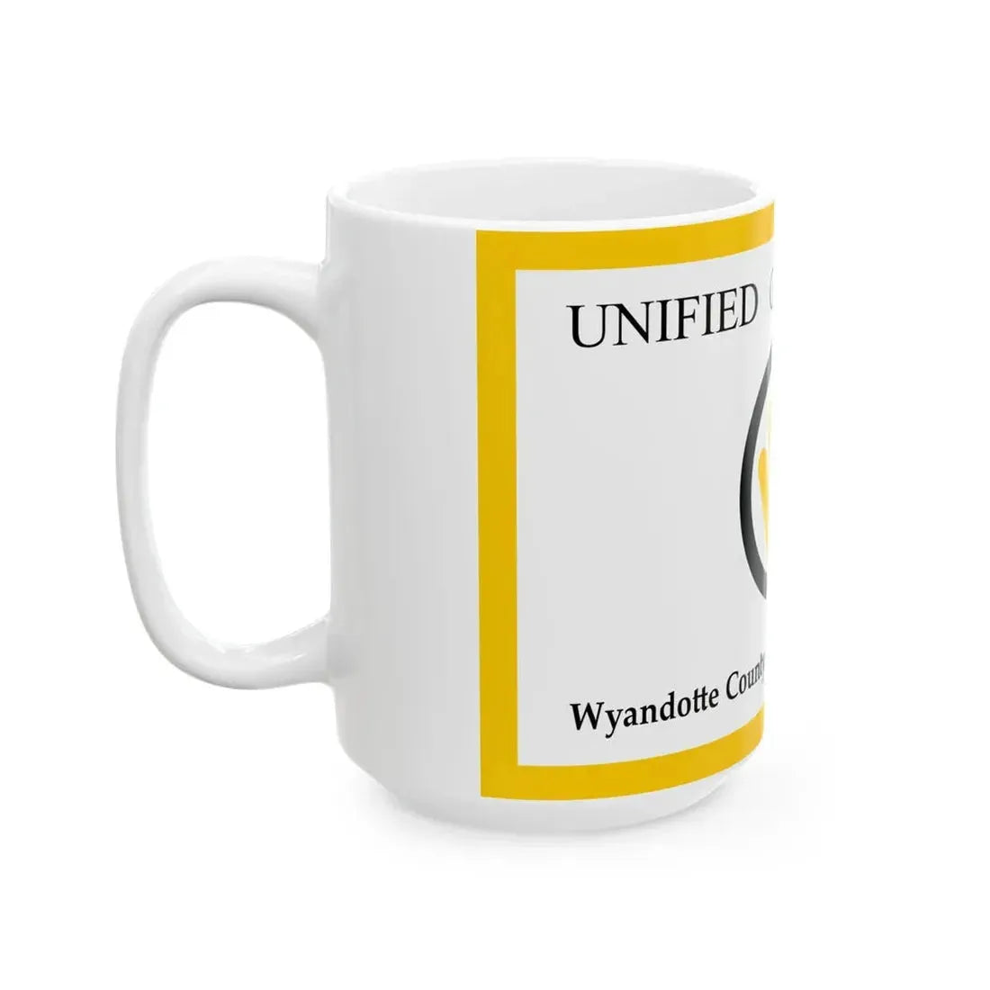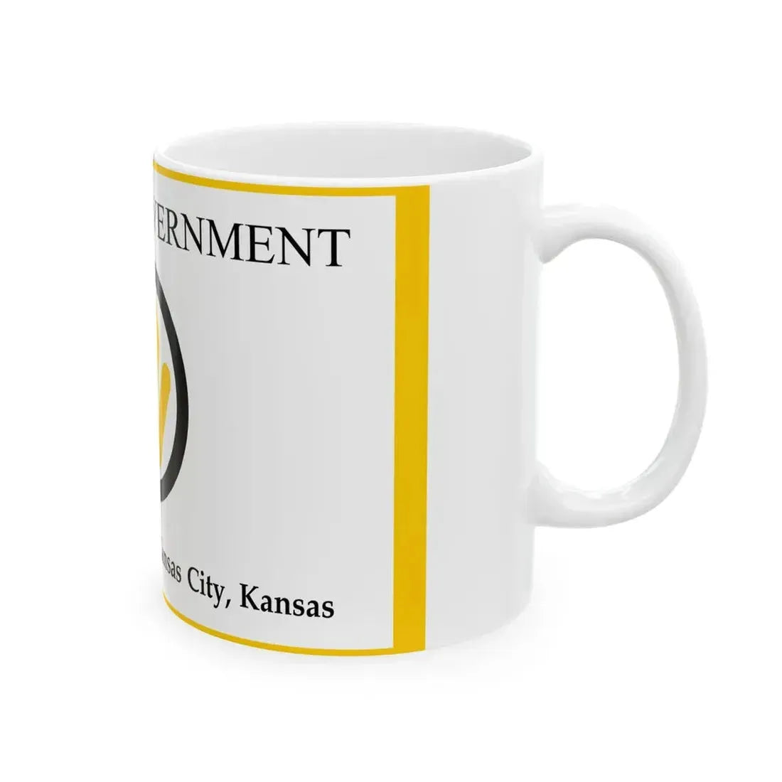The "Flag of Wyandotte County Kansas" design is a tribute to the rich history and symbolism of this county in the United States. The flag's imagery, reproduced on this white coffee mug, includes the official seal of Wyandotte County, which features a shield divided into four quarters. Each quarter represents a significant aspect of the county's heritage: the Wyandot Indians, the Kansas River, the City of Leavenworth, and the industry and commerce that have flourished there.