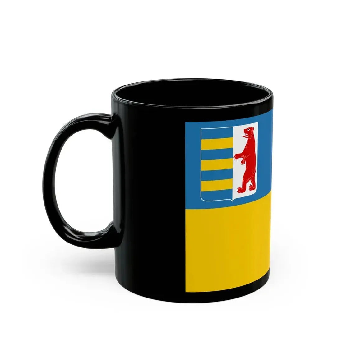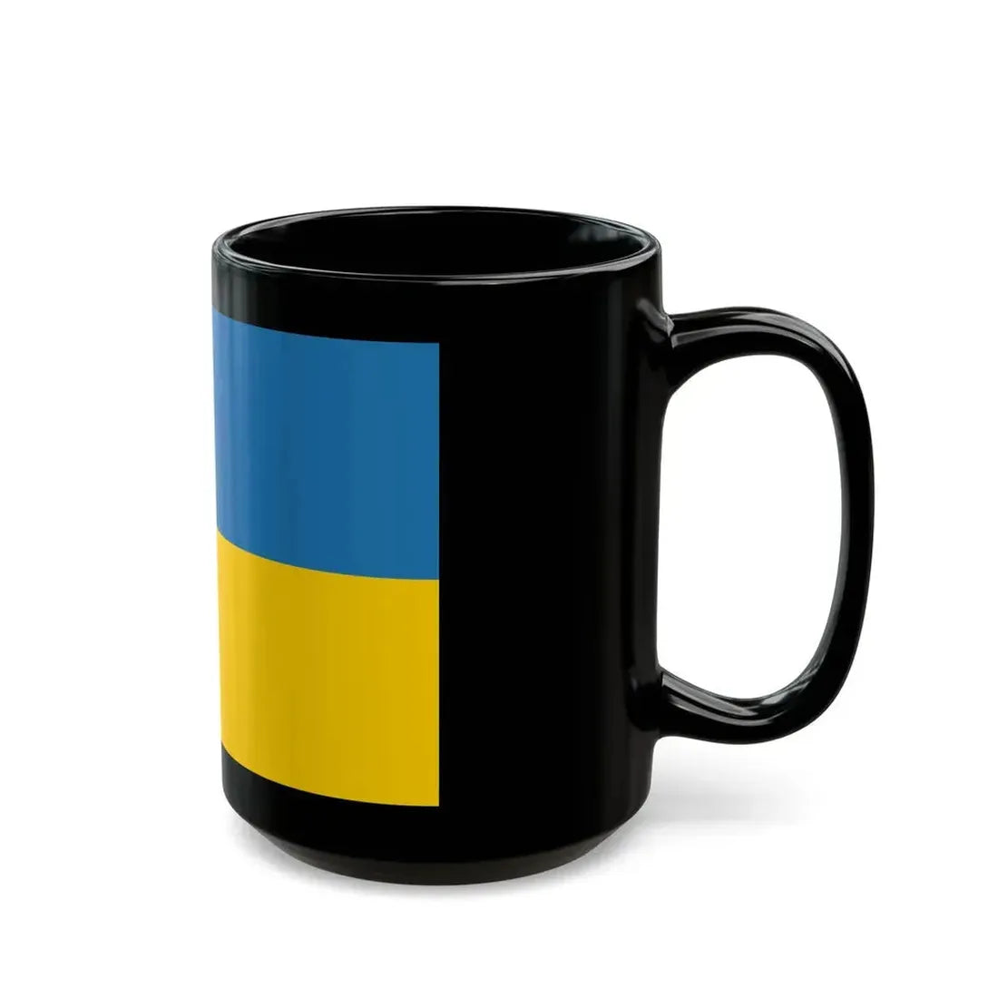 Experience a taste of Eastern European culture with this unique Black Coffee Mug inspired by the Flag of Zakarpattia Oblast, Ukraine. This ceramic mug showcases an intricate reproduction of the region's flag design, featuring the trident symbol, the regional coat of arms, and the blue-and-yellow vertical stripes. The design, reminiscent of traditional Slavic artwork, is a perfect representation for those who appreciate Ukrainian heritage or history.