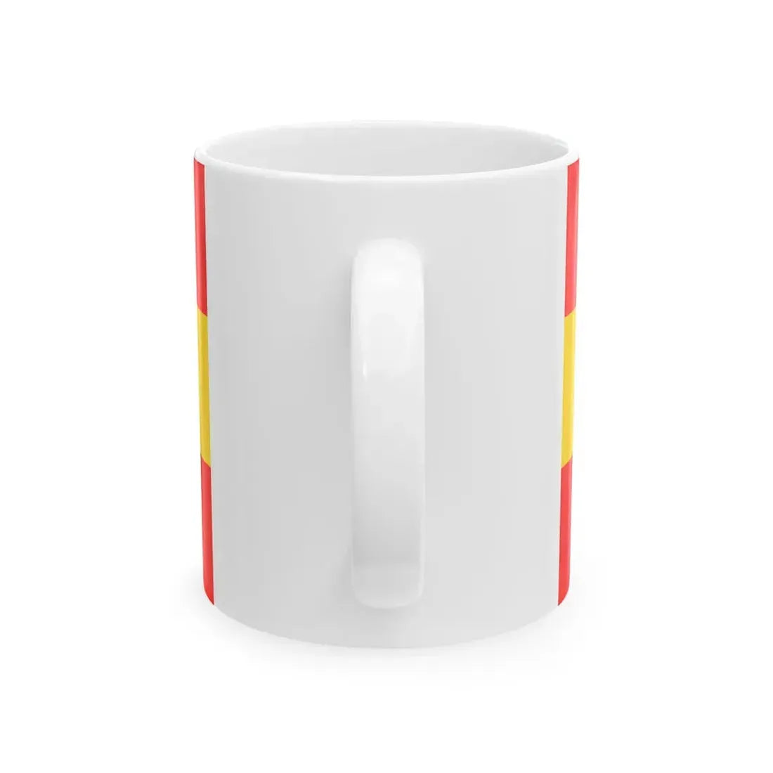 The Flagge Marienhafe White Coffee Mug is a unique piece of drinkware that pays homage to one of Germany's oldest towns, Marienhafe. The design features the town's flag, symbolizing the rich history and tradition that Marienhafe embodies. The flag consists of a white background, a red cross, and a blue canton charged with a yellow tower and three golden stars. This coffee mug is perfect for anyone who appreciates unique and cool drinkware, especially those with an affinity for German culture or travel enthusiasts with a soft spot for Europe.
