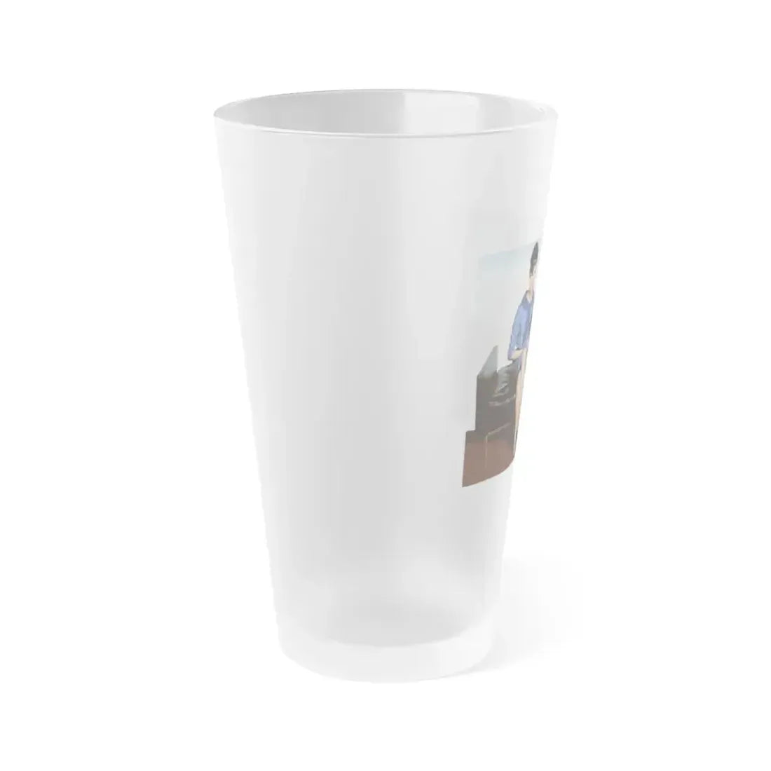 Frosted pint glass (16 oz / ≈0.47 L) with a soft matte finish and semi-translucent, one-sided print. Tough enough for bar and restaurant use, dishwasher safe, and BPA-free — a modern take on classic pintware.