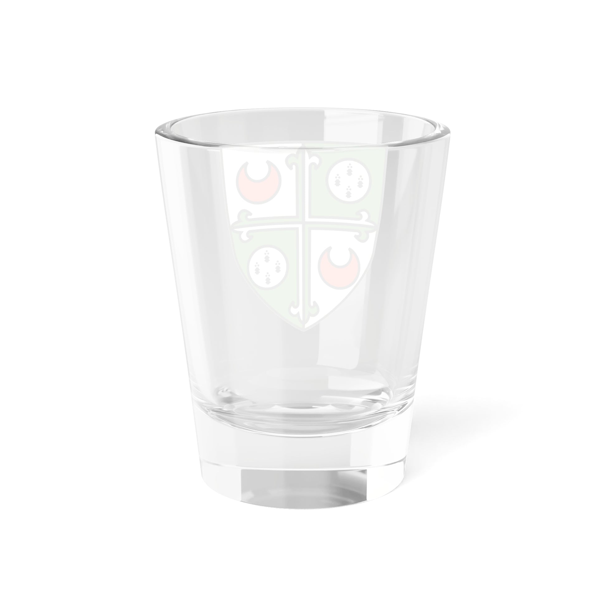 This shot glass showcases the distinguished coat of arms of Girton College, Cambridge, England, a design rich in symbolism and historical significance. The artwork is centered on a shield, meticulously quartered with alternating fields of green (vert) and white/silver (argent).