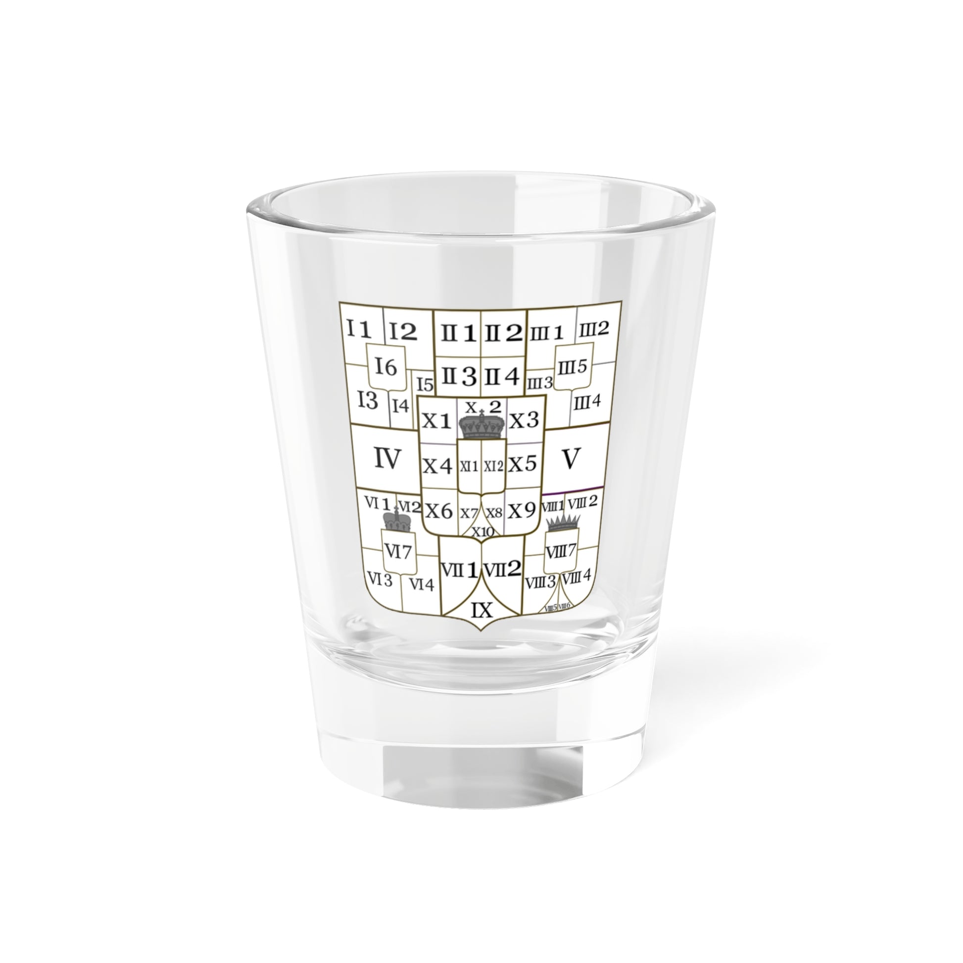 Behold the regal artistry of Joseph II's Greater Arms, now rendered in miniature on this exquisite shot glass. This design is a captivating microcosm of imperial power and dominion, a testament to the vast territories ruled by the Holy Roman Emperor and Habsburg scion.