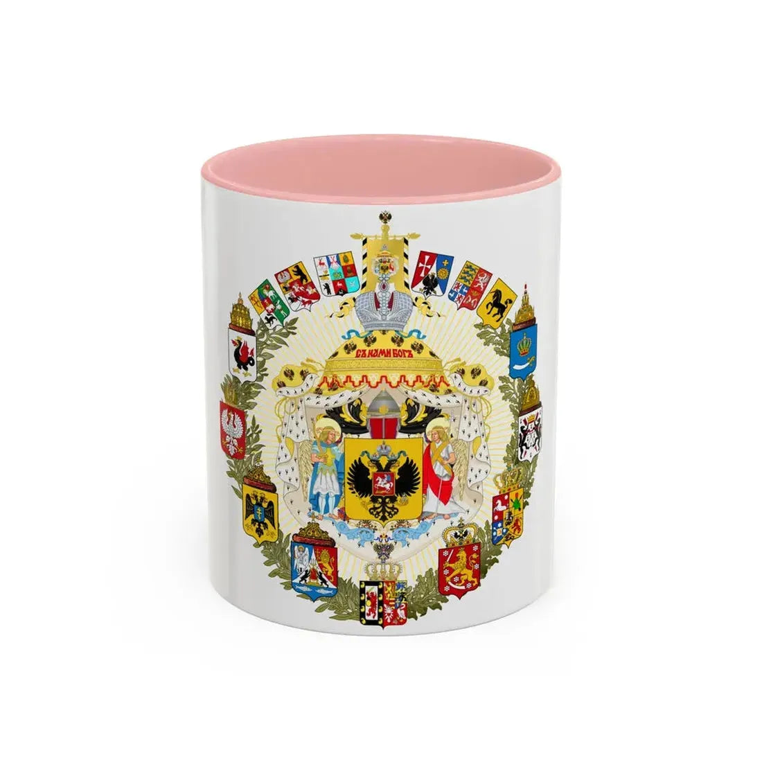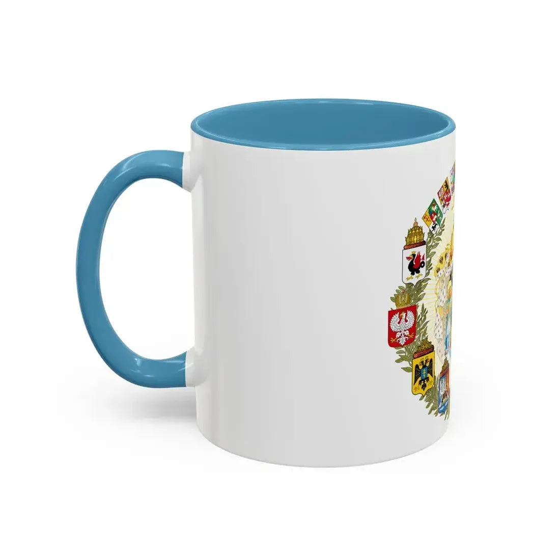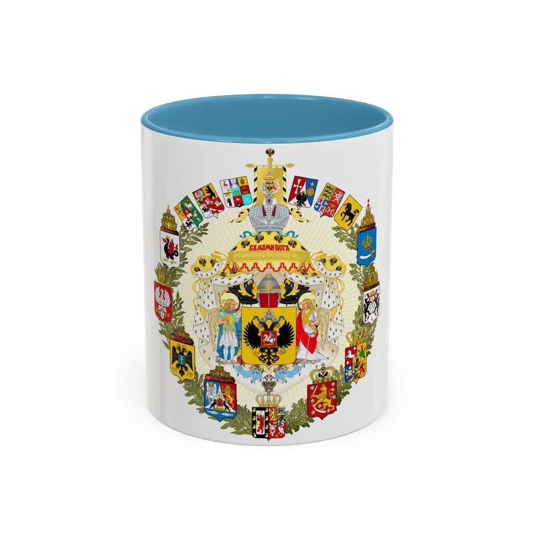 This "Greater Coat of Arms of the Russian Empire - Accent Coffee Mug" is a unique blend of history and functionality. The design, inspired by the greater coat of arms of the Russian Empire, showcases an intricate and symbolic artwork that reflects the grandeur and might of one of the world's most influential empires. The central double-headed eagle, flanked by four smaller coats of arms representing major regions, is a testament to Russia's rich history and diverse territories. This coffee mug serves as an excellent conversation starter for history buffs or anyone with an appreciation for Russian culture.