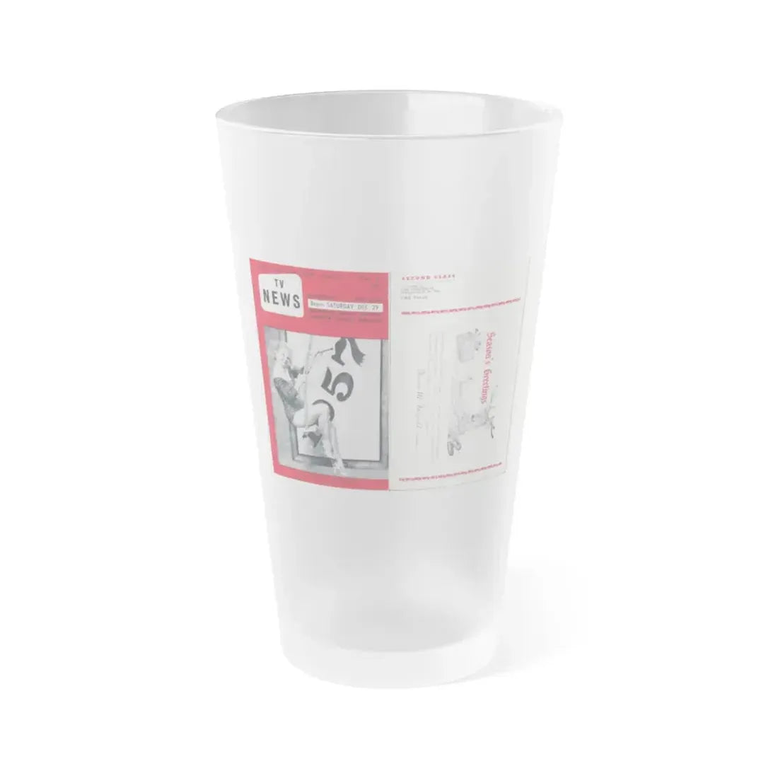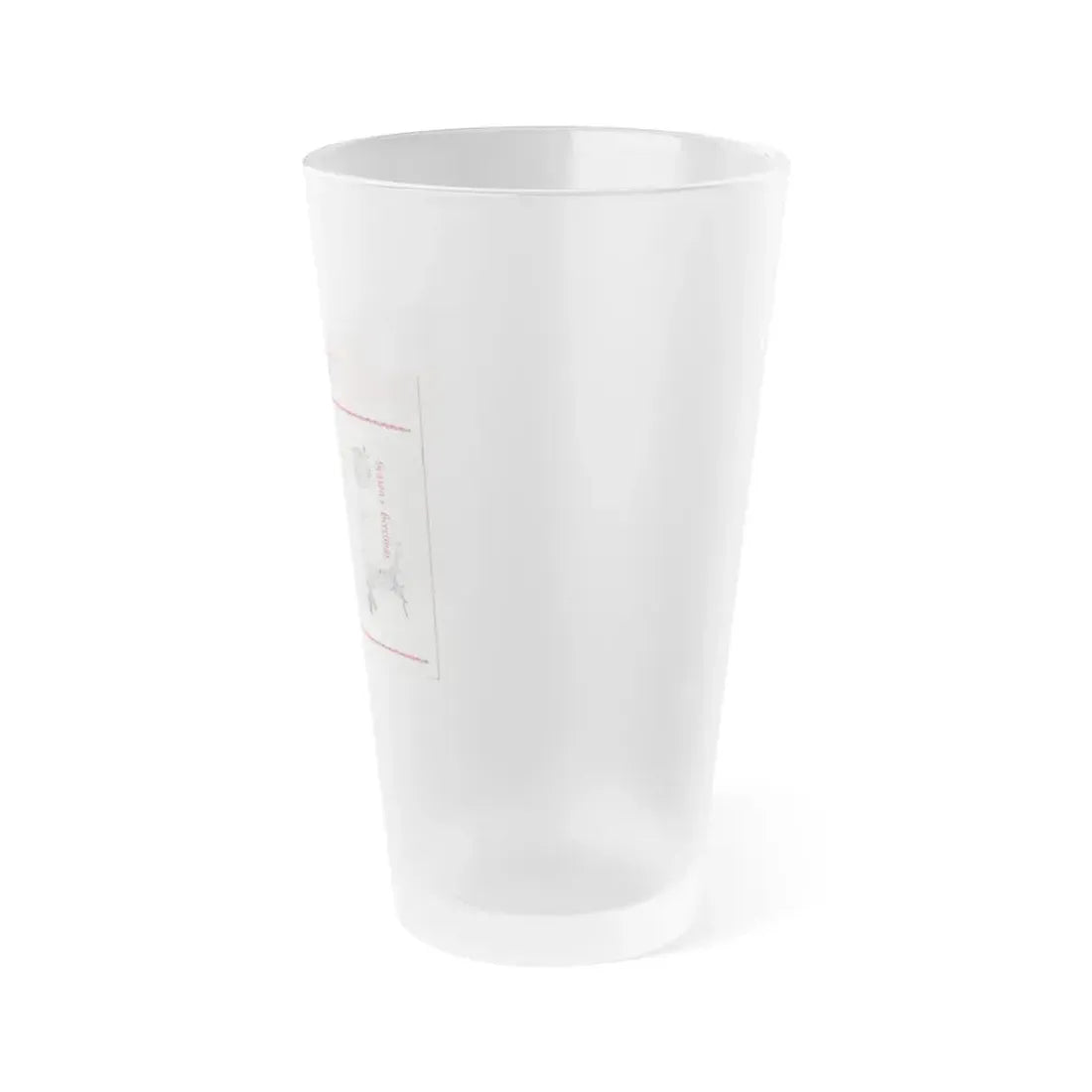 Frosted pint glass (16 oz / ≈0.47 L) with a soft matte finish and semi-translucent, one-sided print. Tough enough for bar and restaurant use, dishwasher safe, and BPA-free — a modern take on classic pintware.