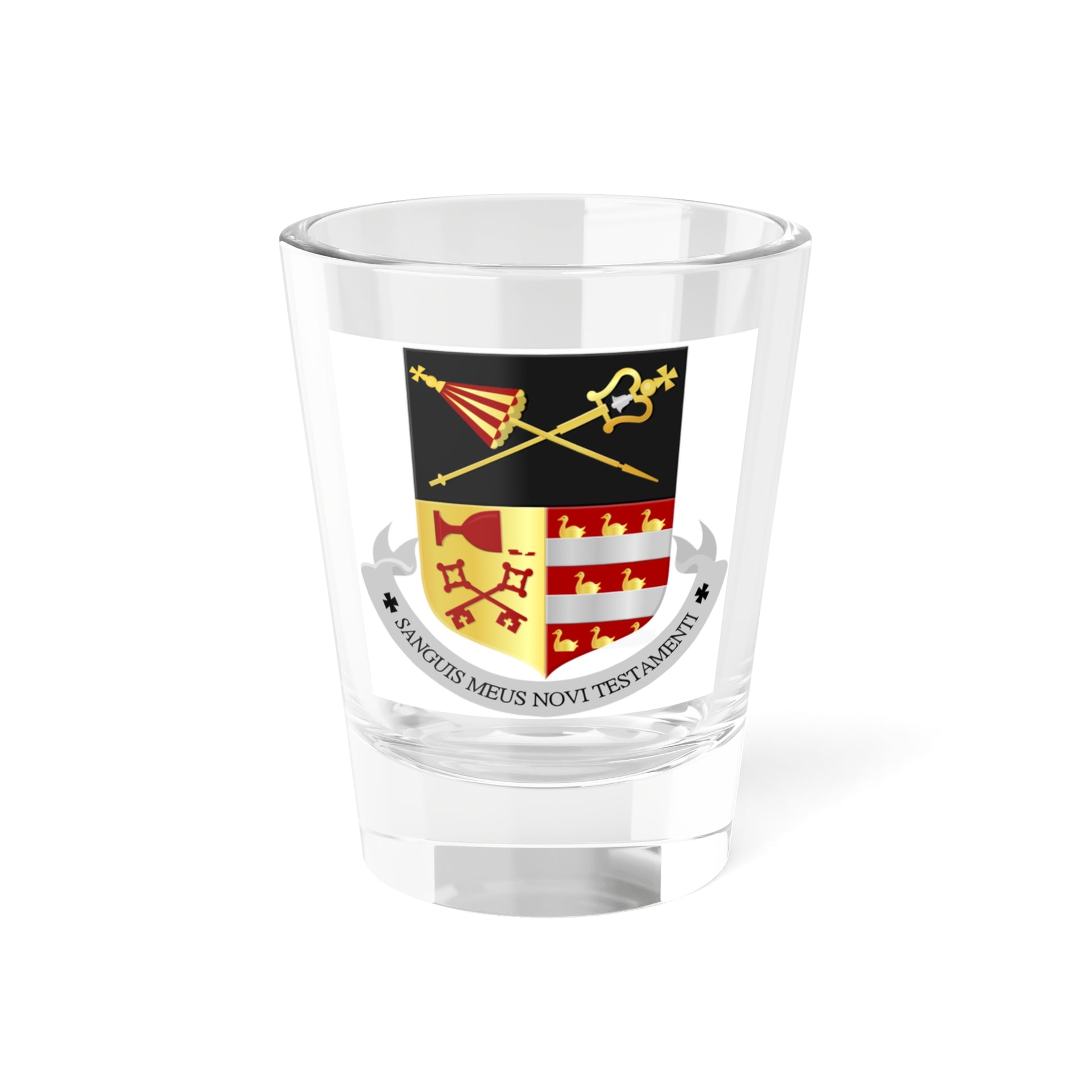Beneath the shield is the motto: "SANGUIS MEUS NOVI TESTAMENTI," meaning "My blood of the New Testament." This powerful phrase further enhances the shot glass's visual impact and reinforces the core tenets of faith that the coat of arms represents.